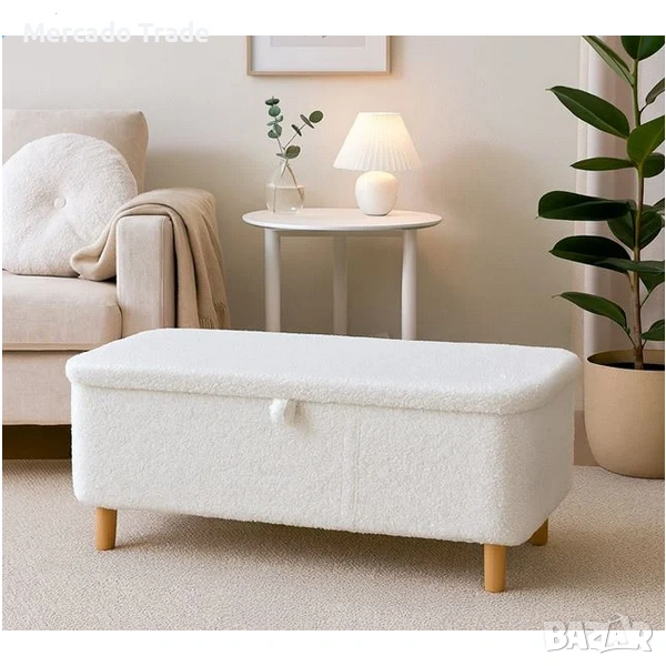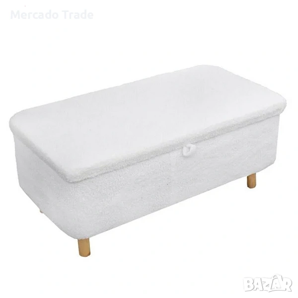 Табуретка с бяла „teddy“ повърхност, дървени крачета и топла текстура. Има капак и място за съхранение с текстилна вътрешна облицовка. Идеална е за съхранение на дрехи, CD или списания, както и за малки възглавници или декоративни покривки до дивана.