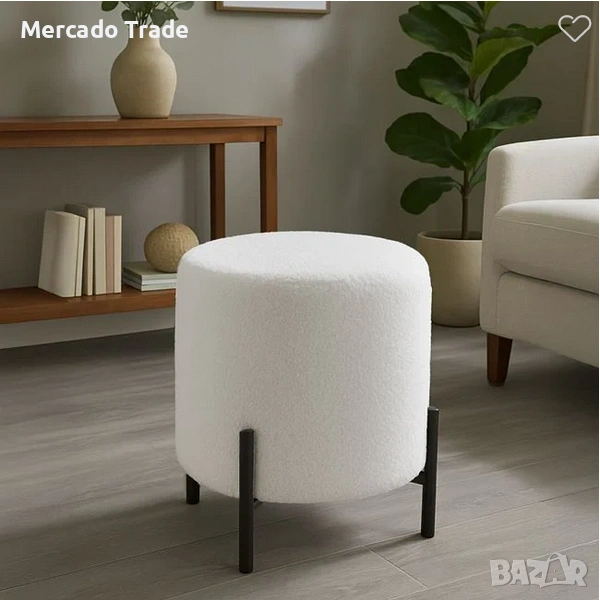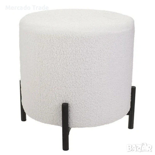 Декоративна табуретка – пуф в цилиндрична форма и бял цвят. Облечена е с тапицерия от букле плат, има дървена конструкция и 4 метални крачета.
