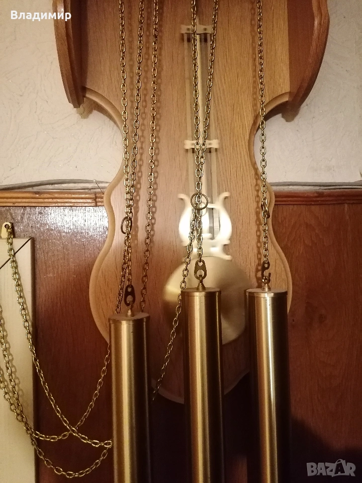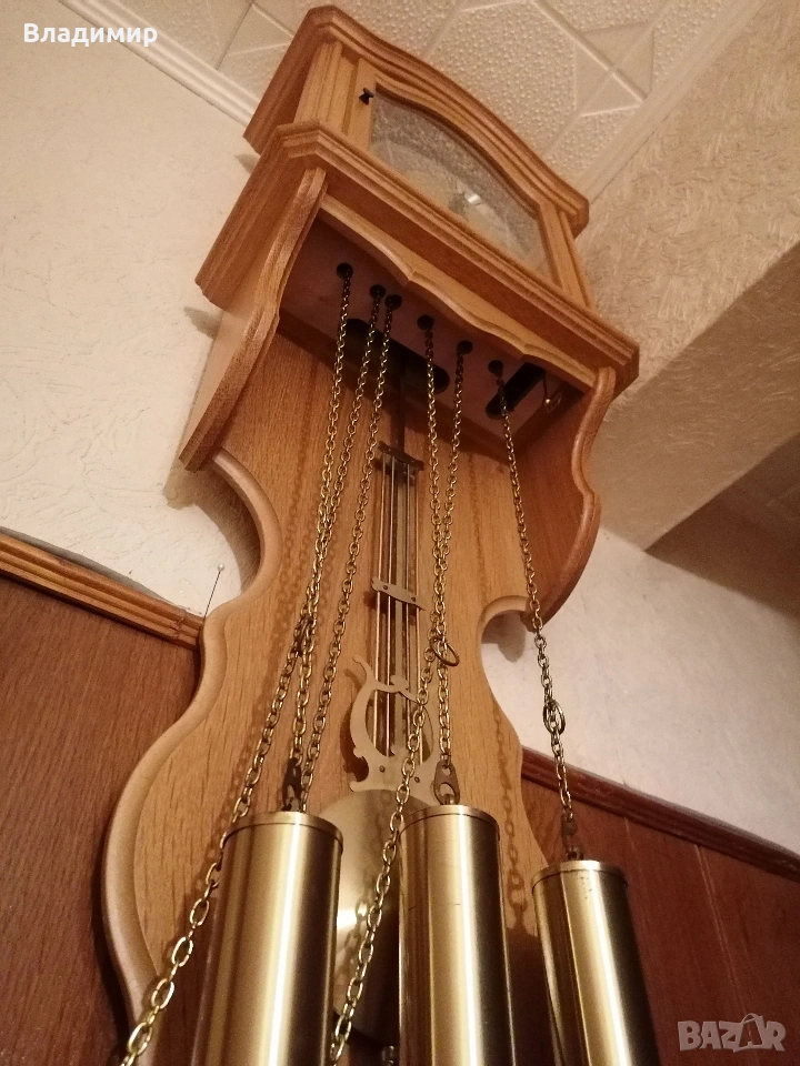 С три топуза-тежести за вървене,за гонг и за мелодия.На всеки 15 минути изпълнява част от мелодията на Лондонския часовник Биг-Бен.На точен час бие гонга толкова пъти,колкото е часът.Размери-висок -90 см,широк 33см и дълбок- 15 см.Преминал пълна профилактика и е в ИДЕАЛНО РАБОТЕЩО СЪСТОЯНИЕ И ПЕРФЕКТЕН ВЪНШЕН ВИД-като нов е !