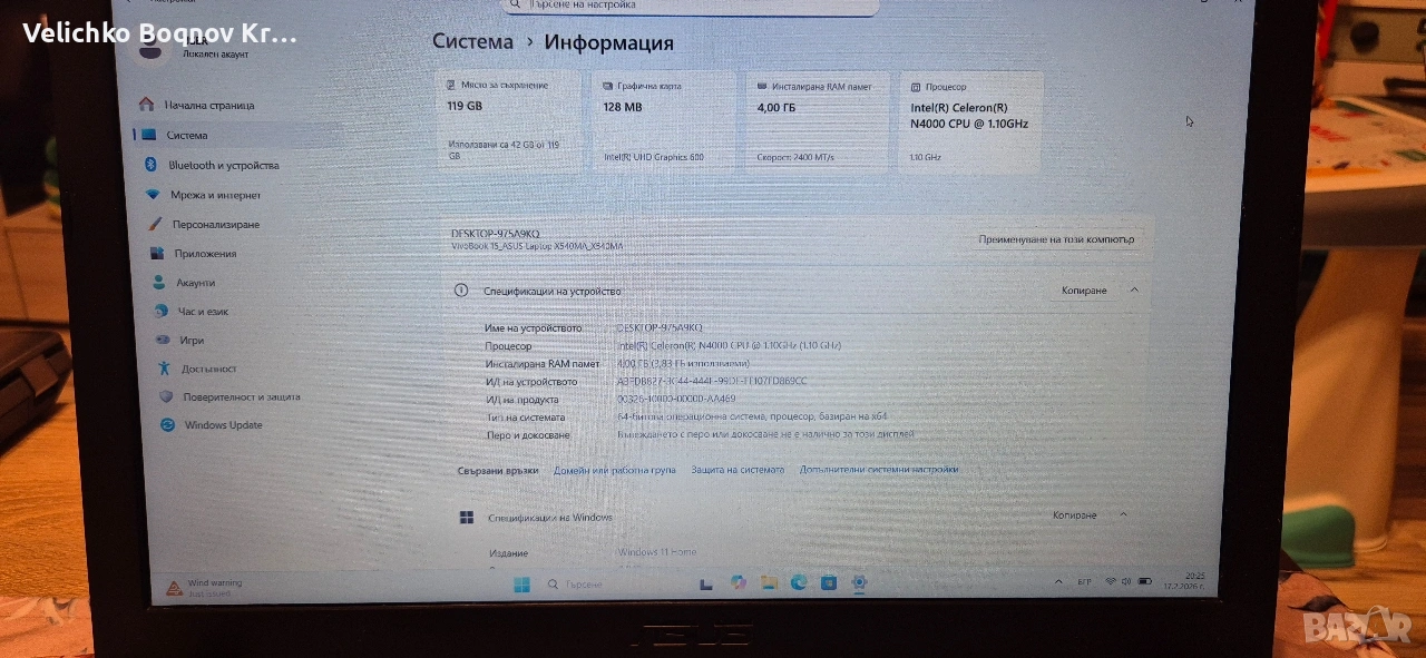 Продавам лаптоп ASUS X540MA, лаптоп перфектен за ученици и за домашна употреба. Почистен със сменена термопаста и преинсталиран с лицензиран Windows 11. Напълно готов за употреба с всички нужни инсталирани програми.В добро състояние има драскотини по горният капак който не пречат на работата. Лаптопа е със чисто нова батерия със 6месеца гаранция. Изпращам листа със гаранцията заедно със него и със старата батерия.