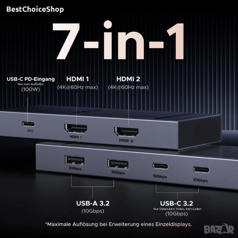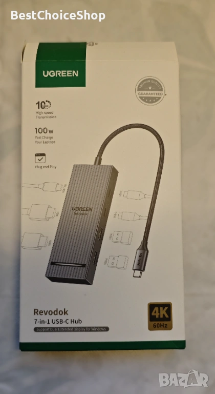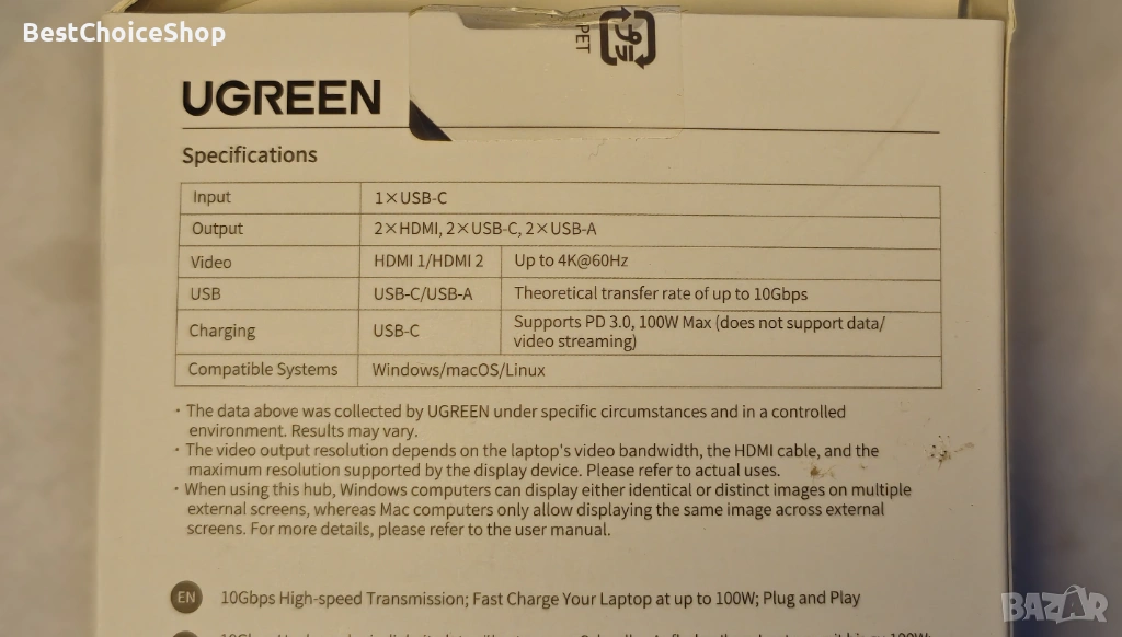Докинг станцията UGREEN се предлага с 2 HDMI, два 10Gbps USB A порта, два 10Gbps USB C порта и PD 100w порт за зареждане и пренос. За да постигнете пълните възможности на хъба, уверете се, че USB-C портът на вашия лаптоп е пълнофункционален или Thunderbolt 3/4 порт и се уверете, че кабелите, които използвате, са съвместими с интерфейса.