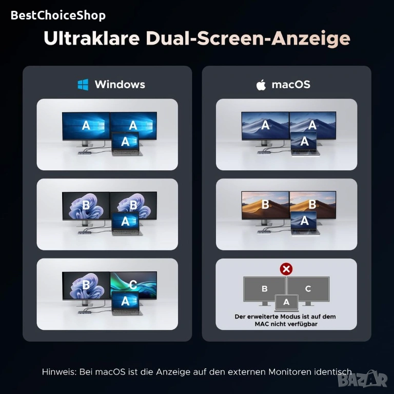 Докинг станцията Type-C е съвместима с ThinkPad X1, ZenBook, Chromebook, Surface и др. Забележка: Системите Windows могат да използват разширен дисплей с два екрана, докато Mac устройствата са ограничени до огледален режим. Ако сте потребител на Mac и искате два външни монитора да показват различни изображения, не препоръчваме използването на тази докинг станция.