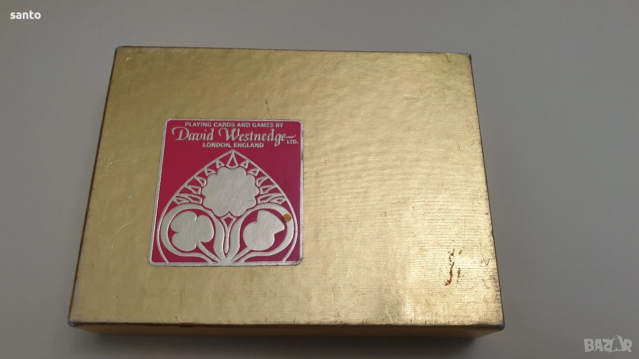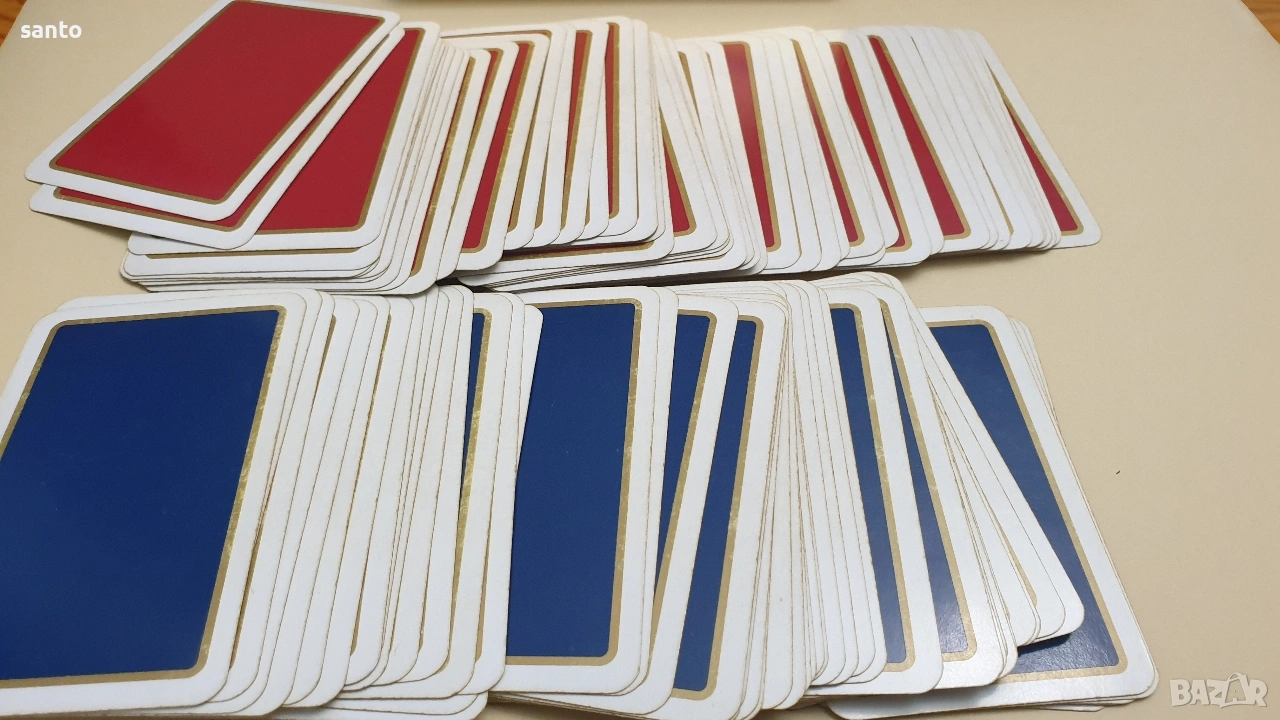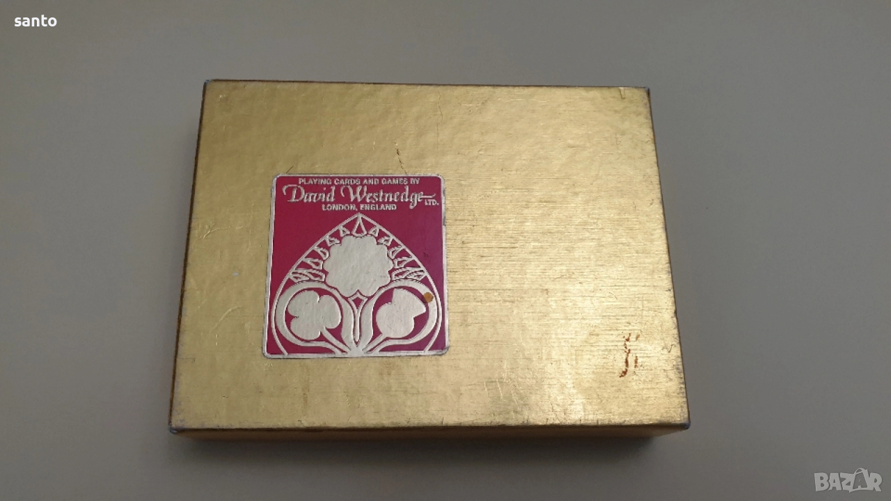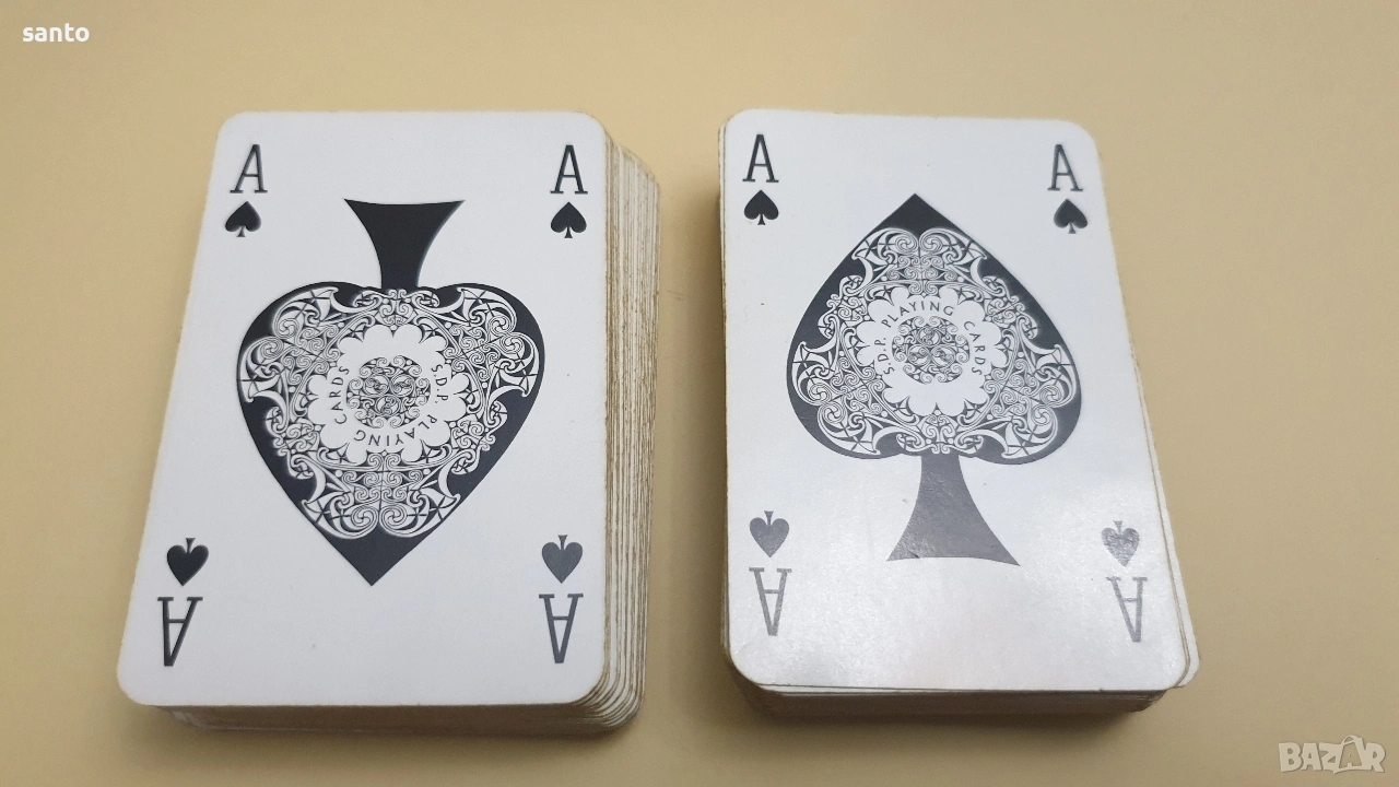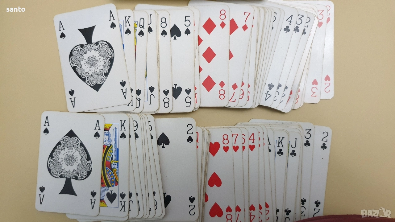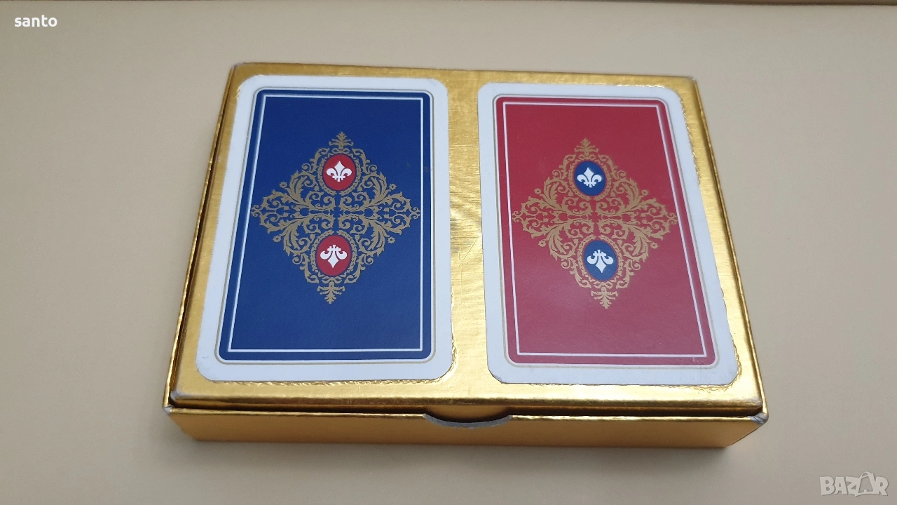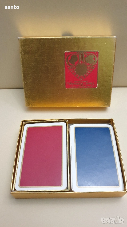 Луксозен колекционерски комплект от две тестета карти за игра.Комплекта е класика от 70 години,две тестета от 52 броя.Запазени за годините си в оригинална кутия.Тези карти са известни със своето отлично качество на печат и гладкост при игра.Тъй като са бридж формат към тях няма жокери.