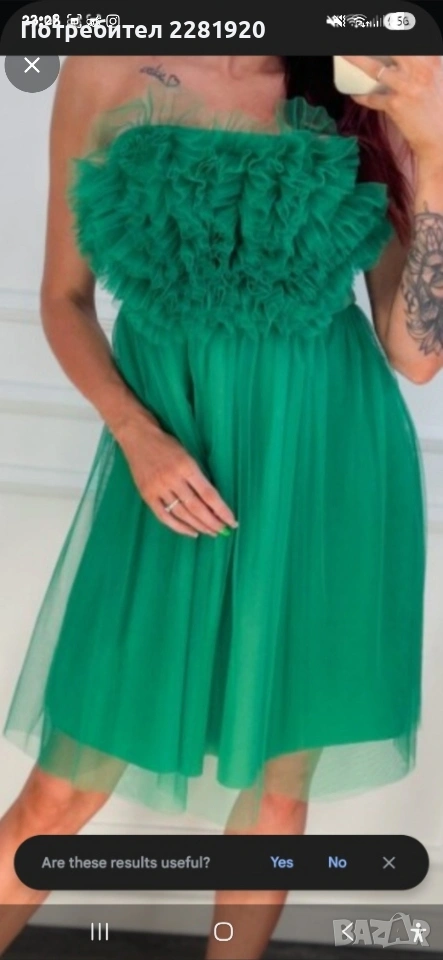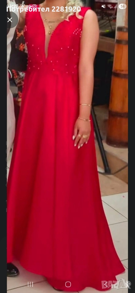 Закупена от бутик в Асеновград. Официален модел с дълбоко А образно деколте и нежни акценти от ръчно пришити перли в горната част.