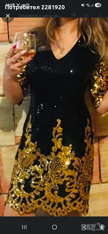Елегантна рокля с V-образно деколте и ефектни златни орнаменти от пайети.