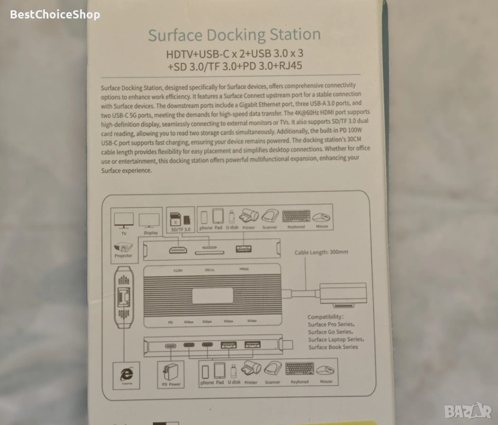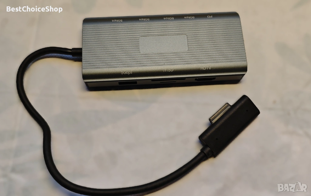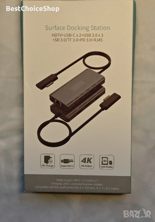 - Многофункционална докинг станция 10 в 1 за Microsoft Surface: с този адаптер Surface Hub можете лесно да разширите лаптопа си от един Surface порт до 10 порта. Ще получите 4K HDMI, 3 USB 3.0 порта, 2 USB C порта за пренос на данни (скорост до 5Gbps), USB C порт за захранване (до 100W), Gigabit Ethernet (1Gbps), четец за SD/Micro SD карти. Насладете се на безпроблемна plug-and-play свързаност с вашите Surface устройства.