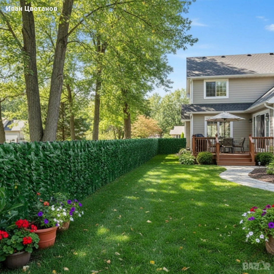 Ограда от зелени листа Конкретните параметри ще ви помогнат да планирате монтаж и покритие: Материал: полиестер Дизайн: красиви листа с релеф и блясък Размер: 3 x 0,5 м (300 x 50 см) Устойчивост: UV защита, водоотблъскваща повърхност, устойчива на избледняване Монтаж: лесно закрепване с връзки, клипове или пластмасови колчета; листата могат да се подреждат за пълно покритие Приложение: огради, балкони, перголи, градински стени, интериорна декорация