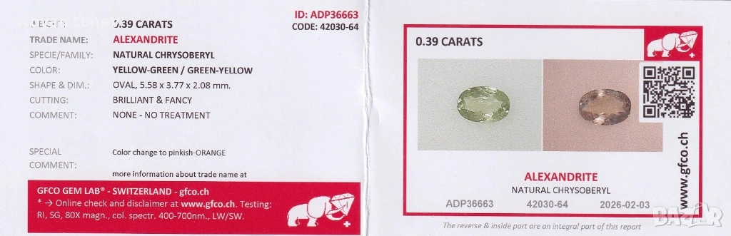 Този александрит е 0.39 карата, овална форма (5.58 x 3.77 x 2.08 мм), от естествен хризоберил, с цвят жълто-зелен / зелено-жълт (под дневна светлина) и промяна на цвета към розово-оранжев (под лампа с нажежаема жичка), според сертификата от GFCO Gem Lab (Швейцария, ID ADP36663, дата 2026-02-03). Обработката е никаква (NONE - NO TREATMENT) – това е рядко и ценно за александрит, тъй като повечето са нагрявани или третирани. Чистотата е SI1 (slightly included) с малък чип (small chipped), леки включвания (игли, линии), но камъкът е прозрачен и с добър блясък (brilliant & fancy cut).