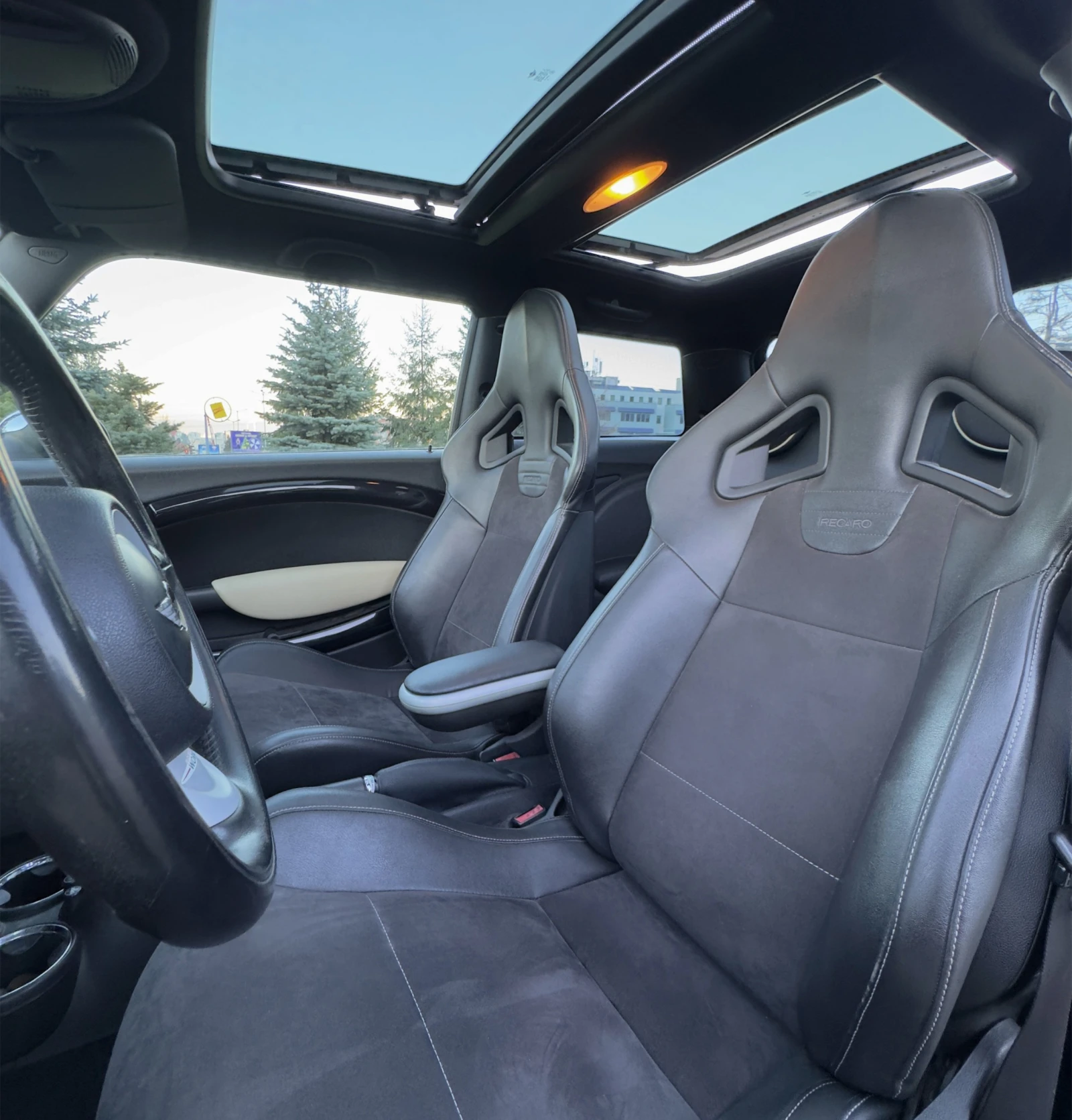 - Оригинален JCW пакет; - Recaro полу кожа, полу алкантар седалки; - Tein окачване с възможност да се регулира; - Camber plates; - Разпънка Chromiumtech; - Фабрична навигация; - Спорт бутон; - Панорама; - Вентилирани спирачки; - Astro black цвят; - John Cooper Works светлини под двете врати; - Сензор за дъжд; - Вътрешен таван от набук; - Пера за смяна на скорости. Обслужена - масло, филтри, свещи. За сериозни купувачи е възможен разумен коментар на цената. Допълнителни въпроси по телефон.