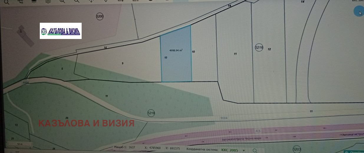 Парцелът е с площ от 5 дка, панорамен изглед към езерото, Варна в посока двете кули и частична към Аспарухов мост.