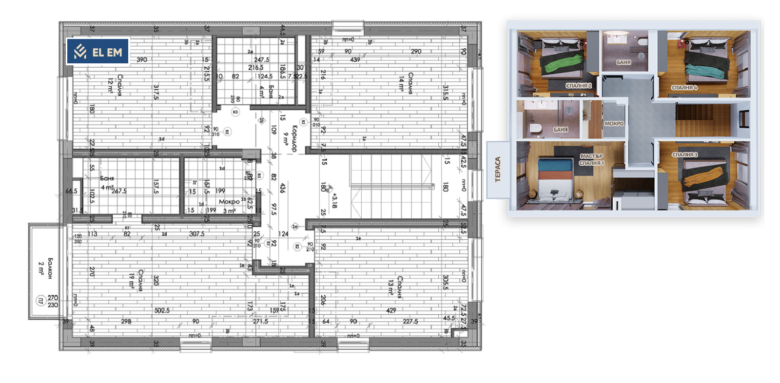 Ниво 2: 4 самостоятелни спални, една от които (19 кв.м.) със собствена баня и ниша за дрешник, баня с тоалетна. мокро помещение и балкон.