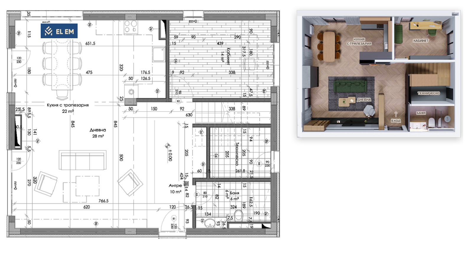 Ниво 1: Голяма дневна с кухня и трапезария - 50 кв.м., входно антре, баня с тоалетна, техническо помещение и кабинет - 14 кв.м., който може да бъде обособен и като още една спалня.