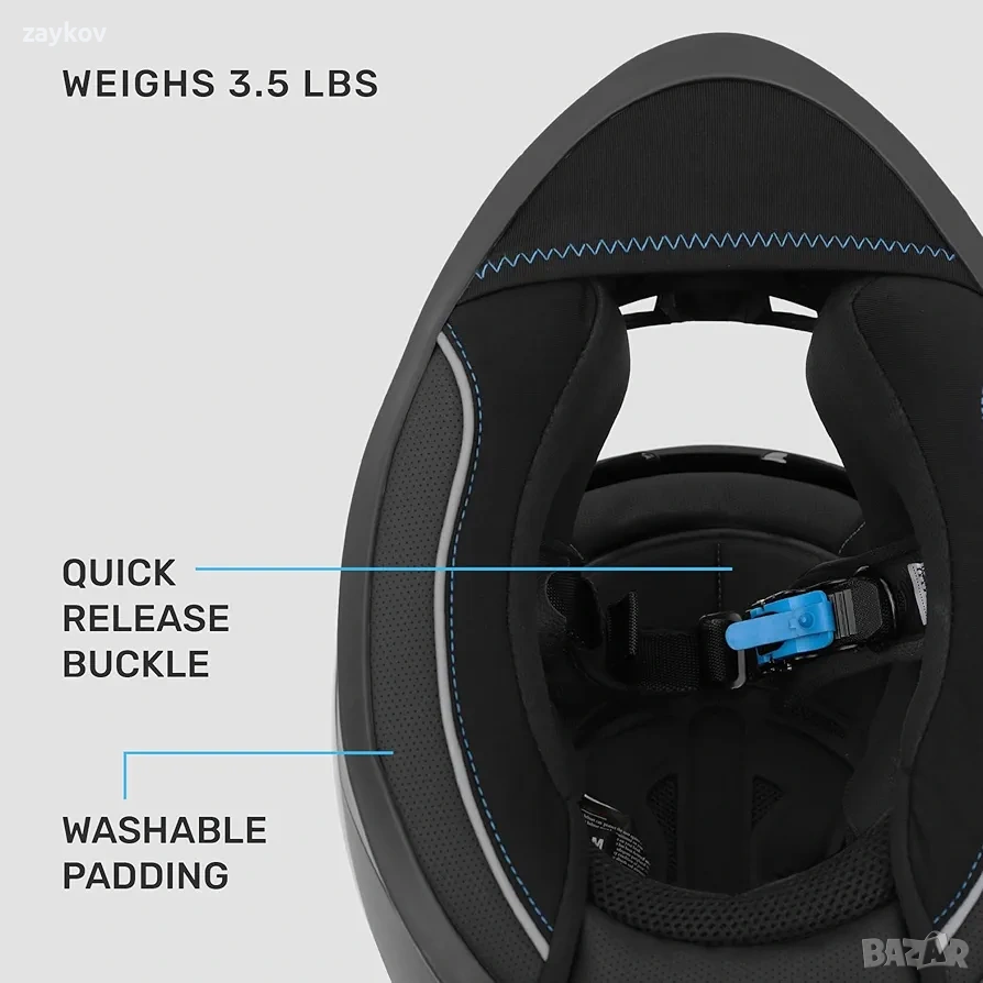 Безопасност: Благодарение на висококачествената си изработка, тази мотоциклетна каска отговаря и надвишава стандартите за безопасност ECE R22.05 и DOT. Каската е одобрена за употреба по всички европейски и американски пътища. Здравата външна обвивка, изработена от ABS, подсилена с 2 см многоплътностен EPS (експандиран полистирен), абсорбира ударите и гарантира, че мотоциклетната каска е лека и осигурява максимална защита.