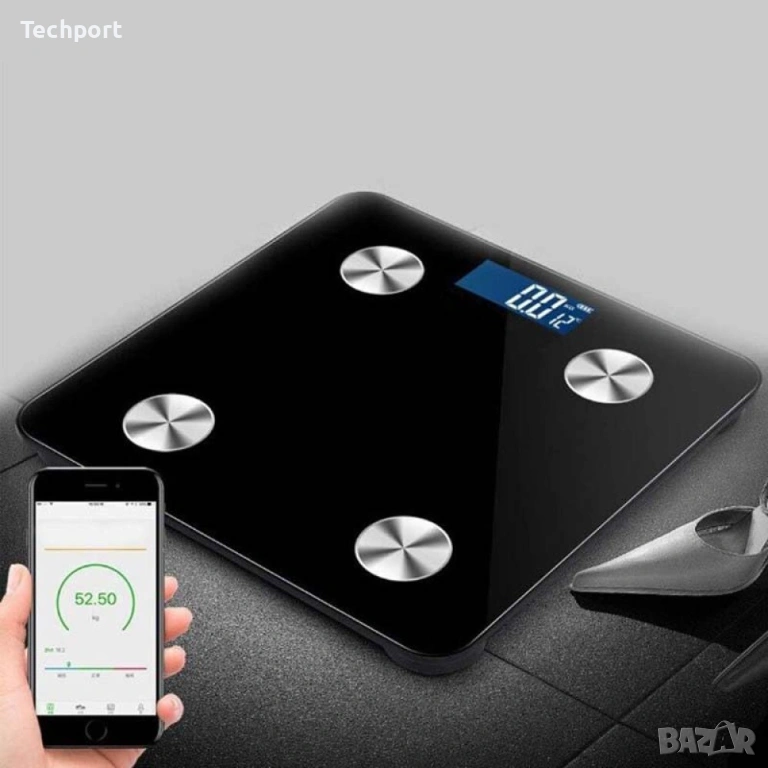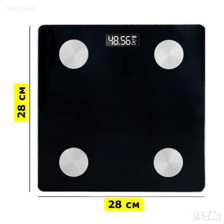 Интелигентна везна, електронна, с дигитален дисплей, изработена от защитено стъкло, нехлъзгаща се, приложение за телефон, Kg/Lb/St, максимално измерено тегло 180 Kg, работеща с батерии, черна