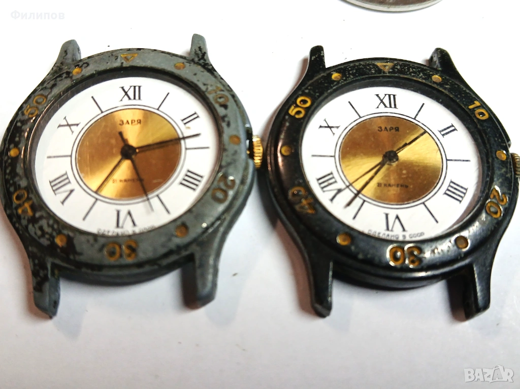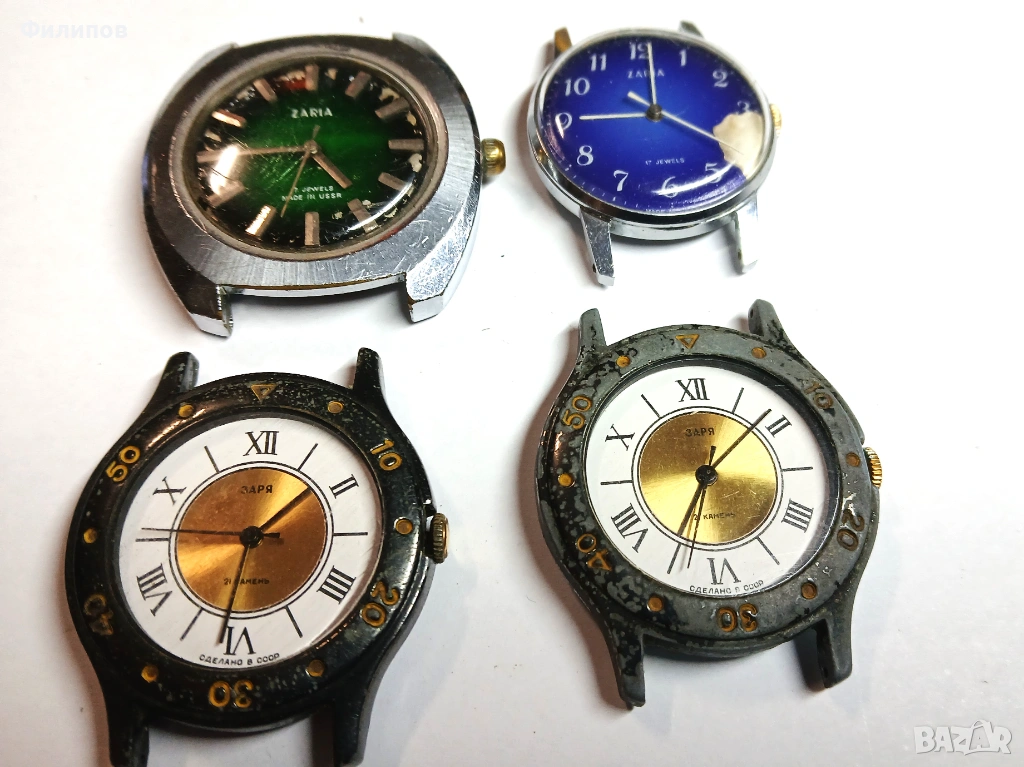 Предлагам лот руски механични часовници "заря" работещи, в добро състояние, два от които с механизми с 17 камъка, другите два с 21 камъка. Цена за всички 30е, отделни бройки 8е. Лично получаване.