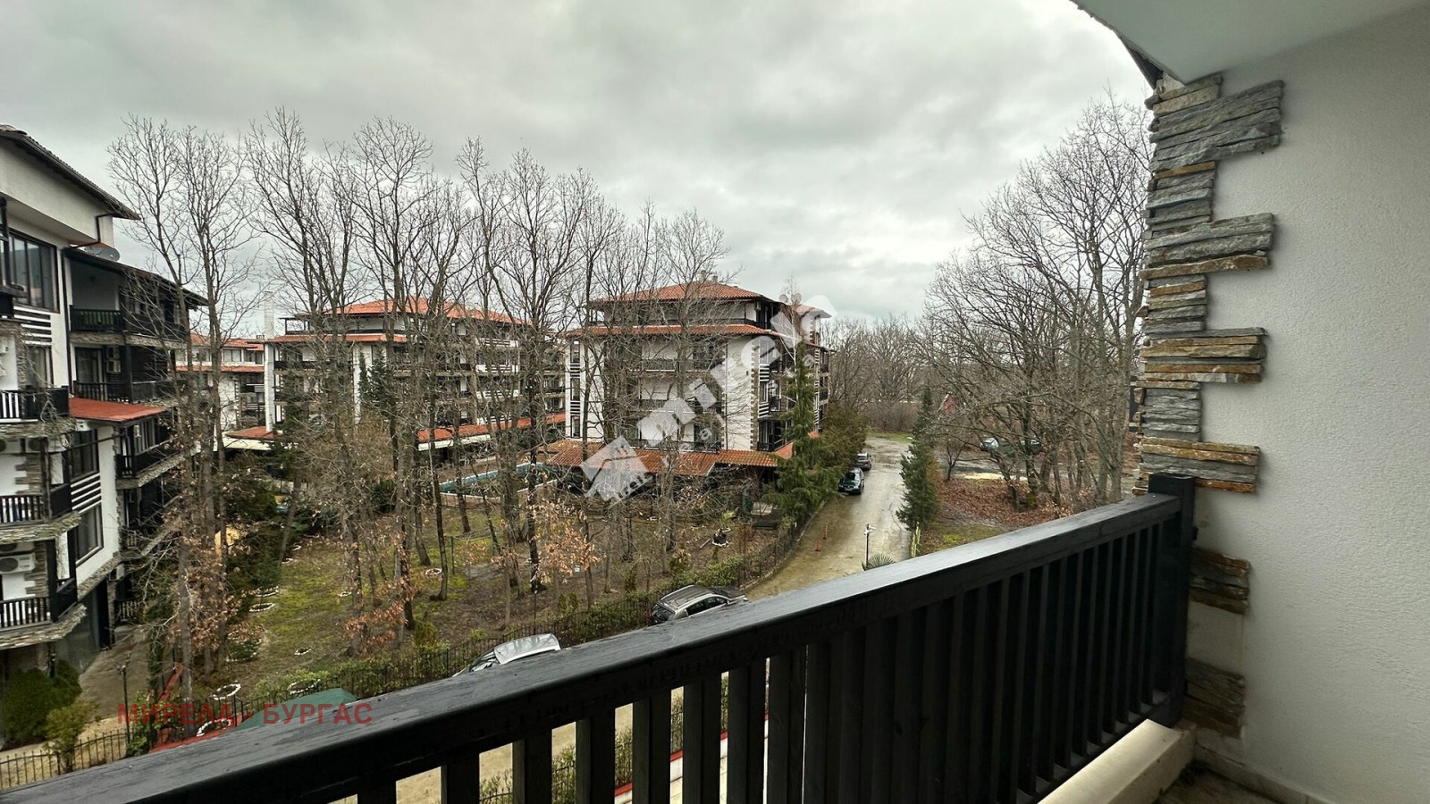 Студиото е разположено на 4ти етаж в сградата, с гледка към басейна и парка. Състои се от антре отворен план, зона за кухненски бокс, дневна и отдих, напълно завършена и оборудвана баня с тоалетна, балкон.