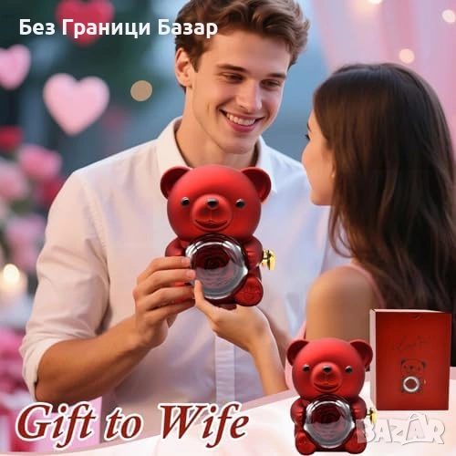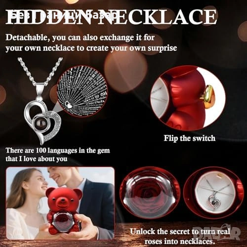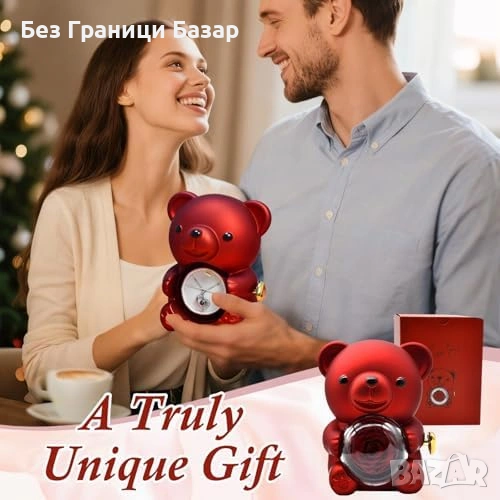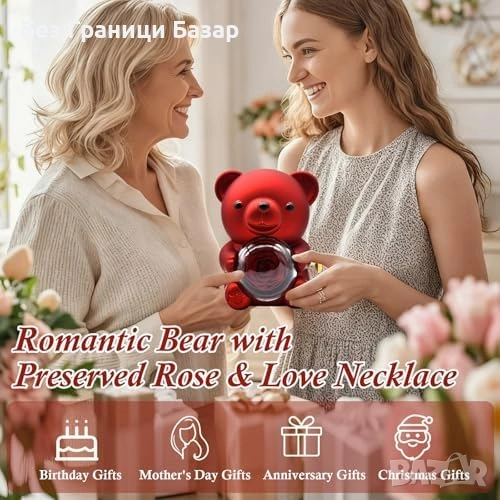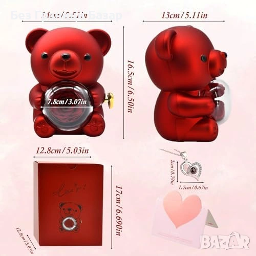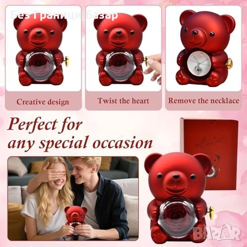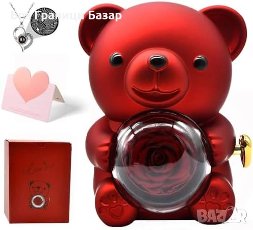 Комплектът включва: 1 меченце, 1 роза, 1 колие, 1 картичка