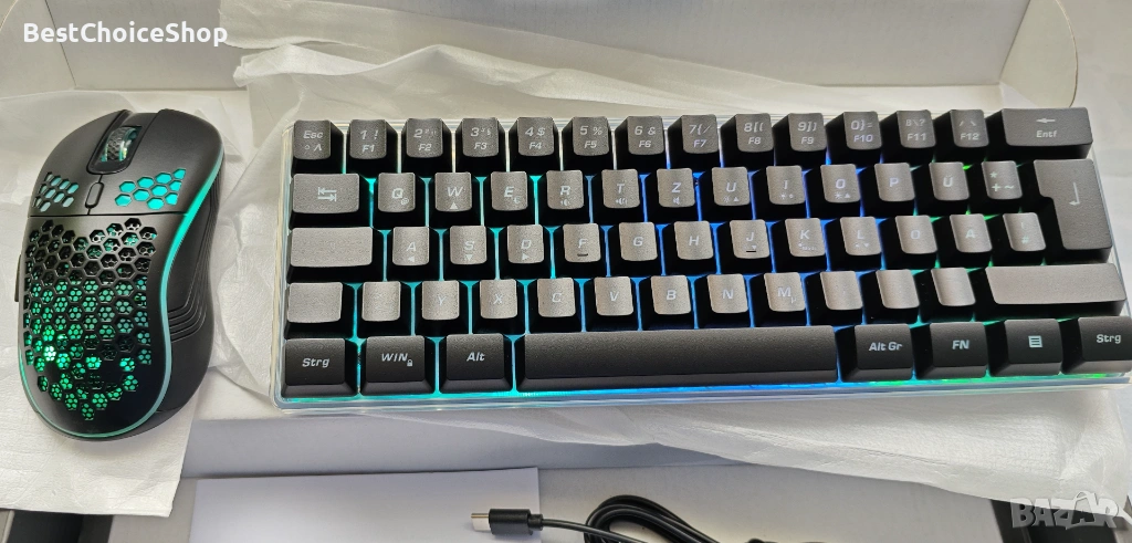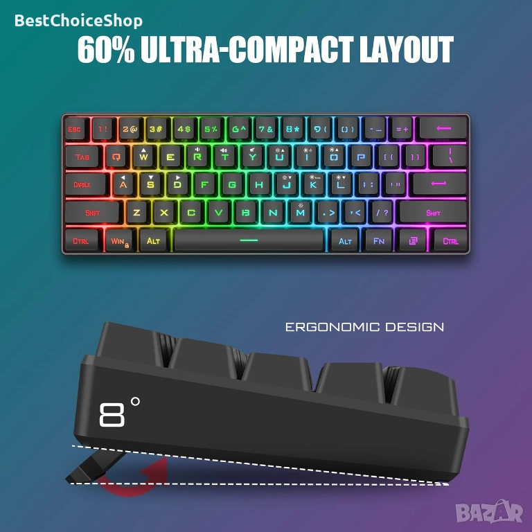 - 62-клавишна мини геймърска клавиатура и ултралека мишка с корпус тип „пчелна пита“: 60% ултракомпактното оформление ви предлага повече пространство за движение на мишката. Добре проектираната мишка с перфориран корпус тип „пчелна пита“ е ергономично проектирана и тежи само 65 (+-5) грама, което я прави по-гъвкава и удобна без умора.