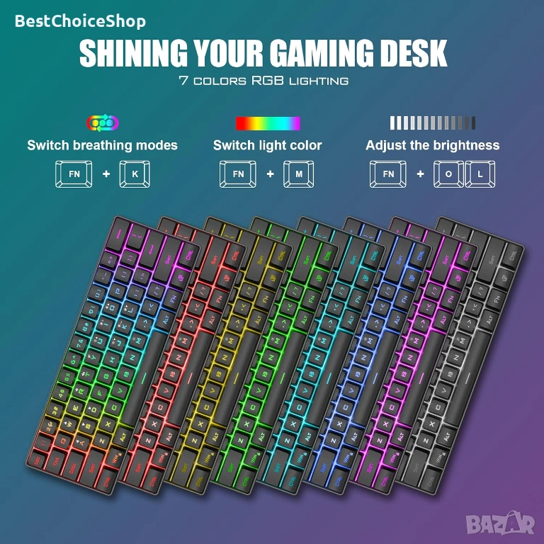 - Безжична RGB клавиатура и мишка: геймърската клавиатура с 60% RGB покритие има 4 режима на RGB подсветка, 4 нива на яркост, 8 монохромни режима на подсветка и 1 пълна дъгова подсветка. Светещият дизайн на буквите и интервалите я прави най-добрата светеща безжична мини клавиатура на пазара. Мишката има вграден 7-цветен цикличен постепенен светлинен ефект.