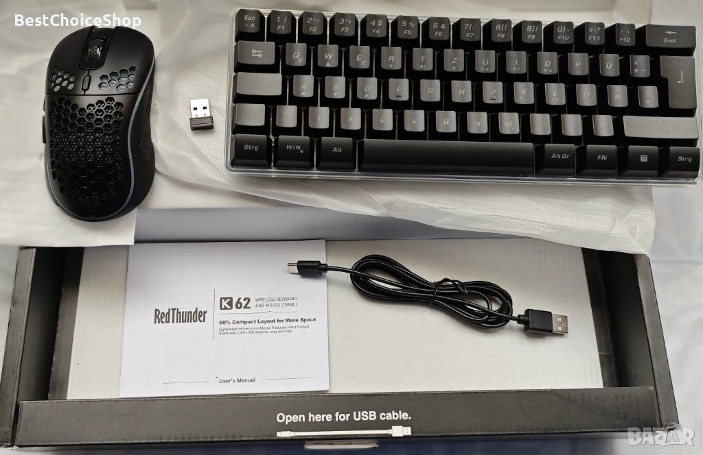 - Мощна 2.4G безжична клавиатура и мишка: Комбинацията от презареждаща се безжична геймърска клавиатура и мишка RedThunder K62 е най-добър избор. 2.4G високоскоростното и стабилно предаване гарантират, че тя може лесно да се справи дори с най-интензивните битки. (USB приемникът се намира в долната част на мишката).