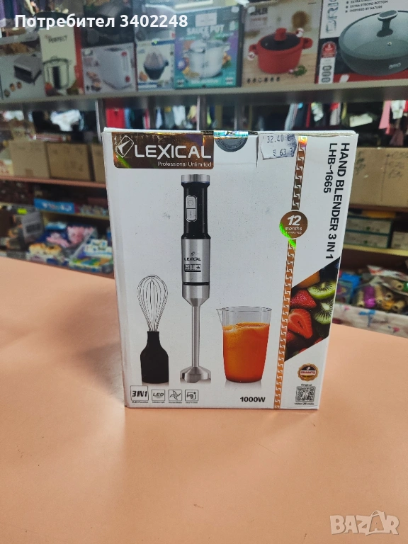 Lexical LHB-1665 1000W 3-в-1 ръчен блендер - Марка: Lexical - Напрежение: 220-240V ~ 50/60 Hz - Мощност: 1000W - Ножове: 4 титаниеви ножа - Скорост: Множество настройки + Турбо функция - Индикатор: LED светлина - Дизайн: Защитен от пръски - Вместимост на чашата: 650 мл - Аксесоари: Бъркалка за яйца, мерителна чаша