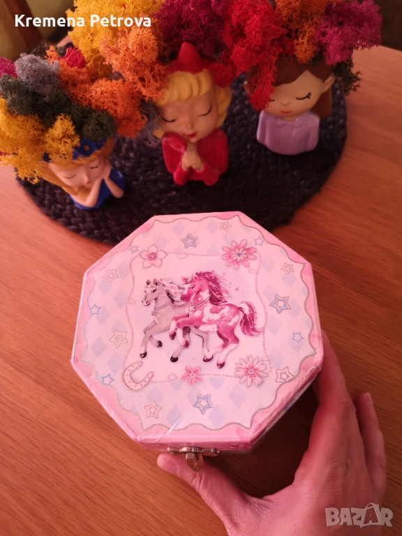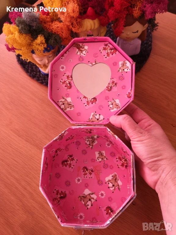 Снимка 13 и 14: Детска кутия за бижута, фибички, ластичета и други с огледало, с нормални следи от употреба. Цена 3,00 €
