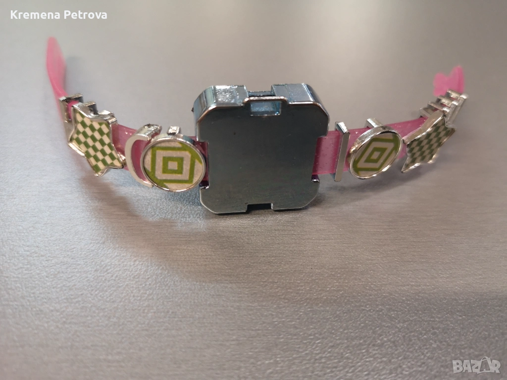 Снимка 8 :Детска гривна. Гривната е с розова каишка и метални елементи. Централният елемент е голям, метален и с правоъгълна форма. От двете страни на централния елемент има по два по-малки, кръгли елемента с шарки. 1,00 €