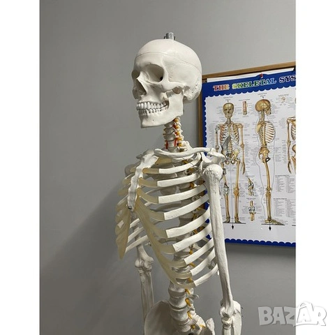 • Анатомичен модел на човешки скелет с всички основни кости – череп, гръбнак, ребра, крайници и таз