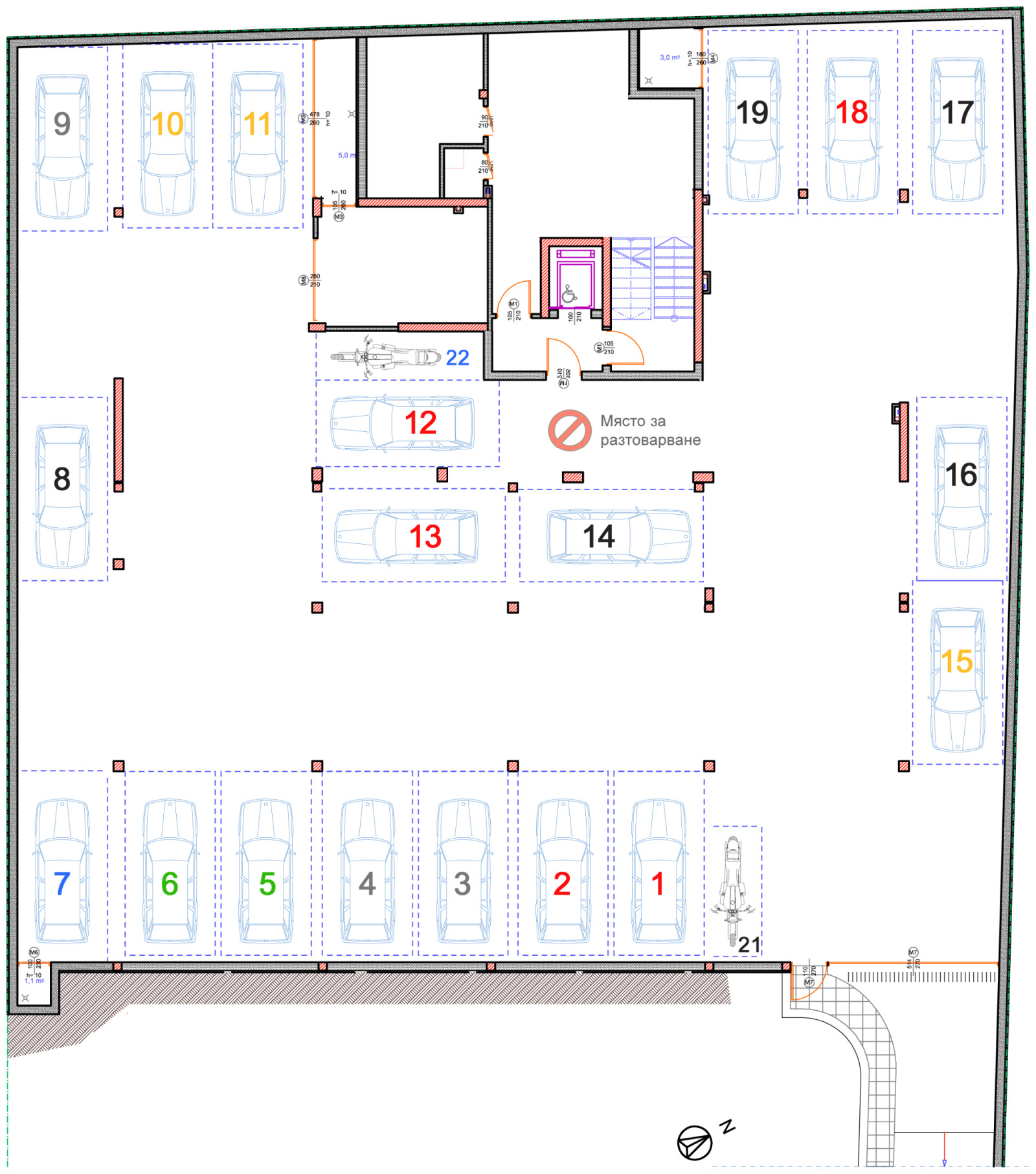 Към офиса се предлагат и паркоместа в закрит, или открит паркинг на сградата на стойност 80 Евро и 45 Евро на месец с отваряне чрез дистанционно и с мобилен телефон. Към офиса има общо до 8 паркоместа в паркинга.