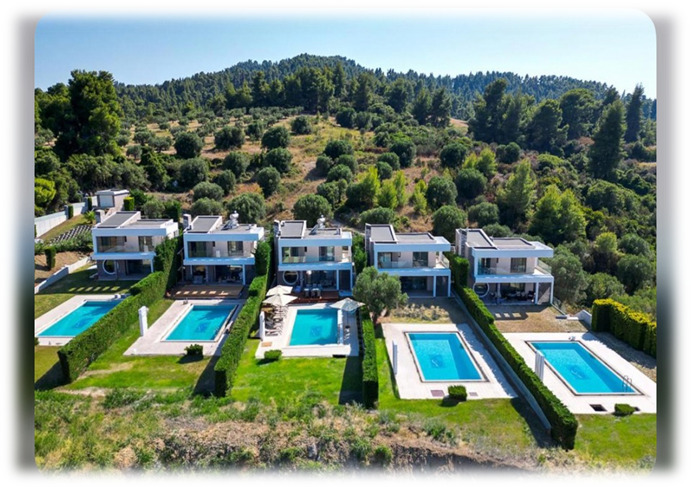 5 броя Вили, всяка от които с цена от 900 000 Евро, построени през 2020 година. Две от тях са с площ 160 кв.м., а три от тях - с площ 180 кв.м. 3 нива: полусутерен с 1 спалня, всекидневна, склад и електрически бойлер. Сутерен - просторна всекидневна, кухня и трапезария, баня; първи етаж - 3 спални и баня с вана. Те имат слънчеви панели, електрически бойлер за отопление, подове със специални плочки и мрамор, енергийна камина, шуко рамки, италианска кухня и мебели. Луксозни строителни материали.