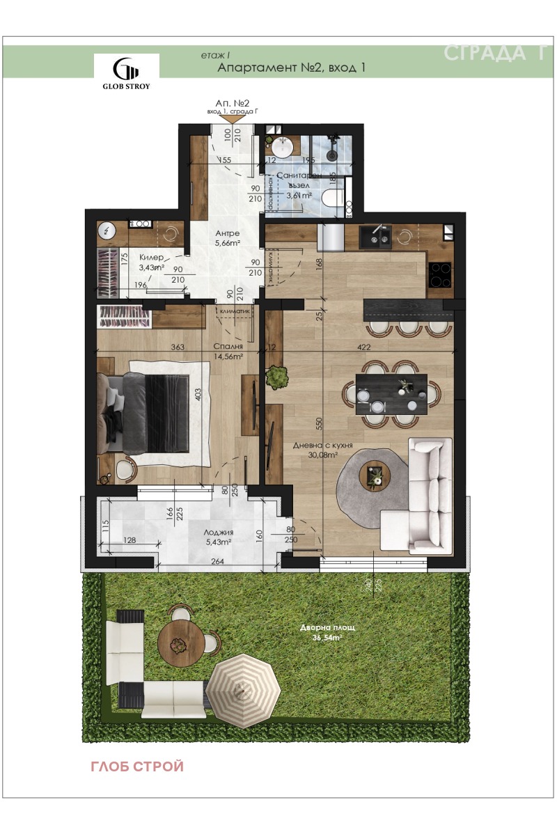 Ситуиран в сграда Г , вход 1 , ап. 2 - на първи жилищен етаж с изложение юг. Състои се от просторна дневна, спалня, баня с тоалетна, килер, терасa и двор с обща площ 36.54кв.м. Жилището е с обща площ 83.28 кв.м., от които ЗП 72.81 кв.м.