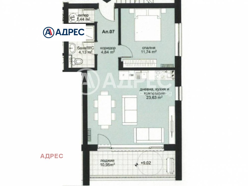 Жилището се състои от входно антре (коридор), което осигурява удобно разпределение към всички помещения. Просторната дневна с кухня и трапезария е проектирана като светло и приветливо общо пространство с възможност за обособяване на различни функционални зони. Спалнята предлага уют и спокойствие, подходящи за пълноценна почивка.