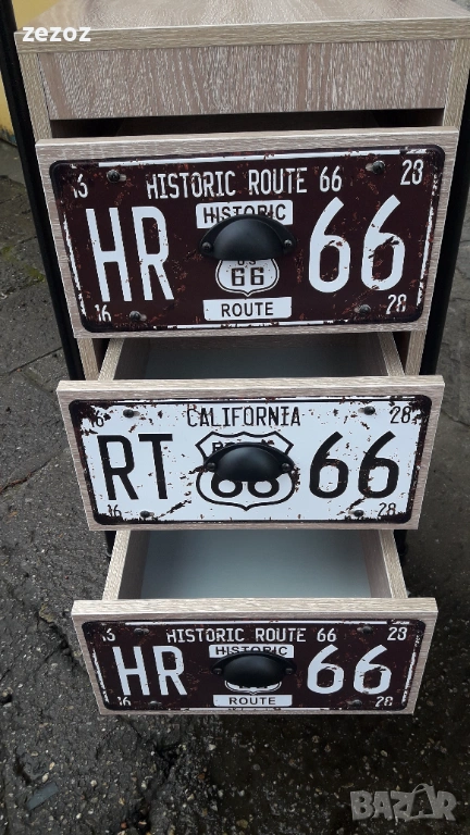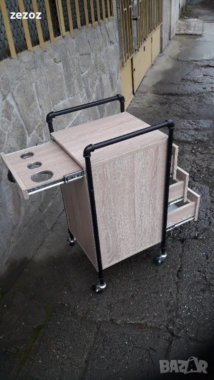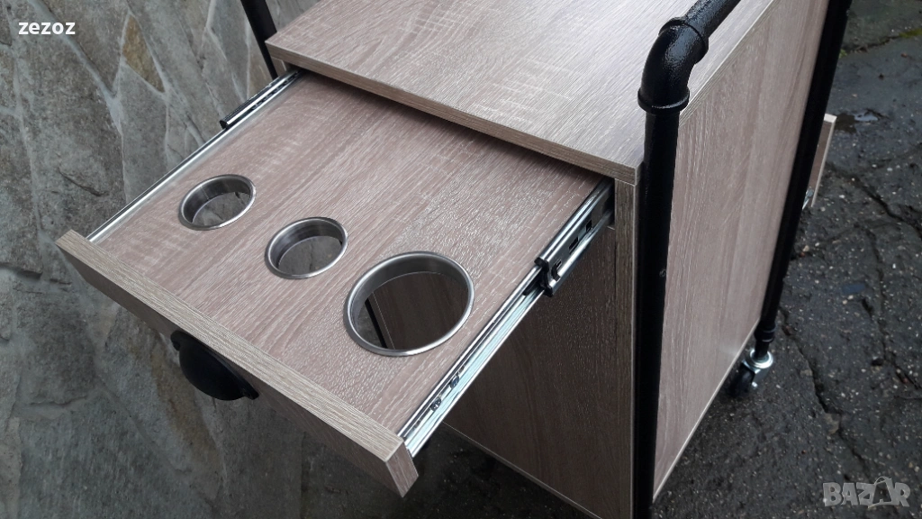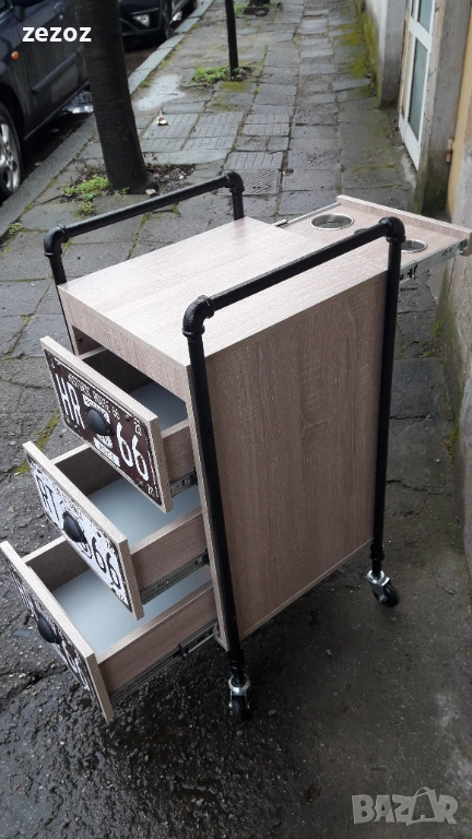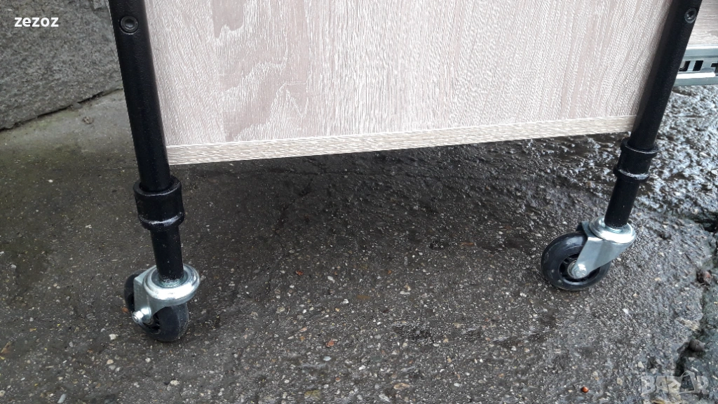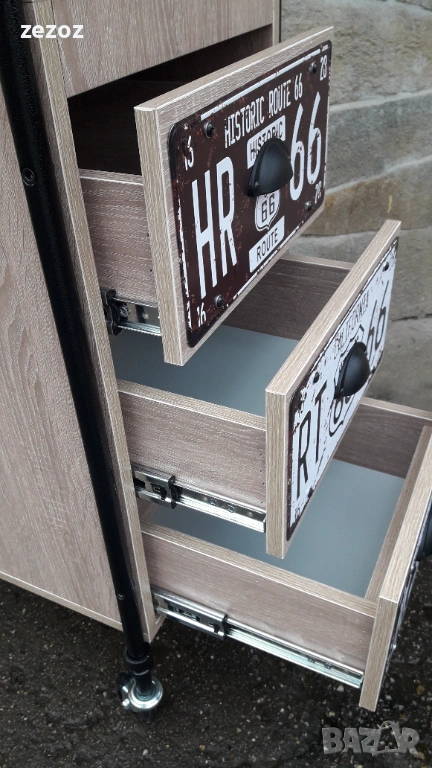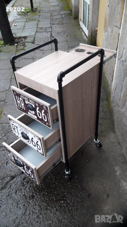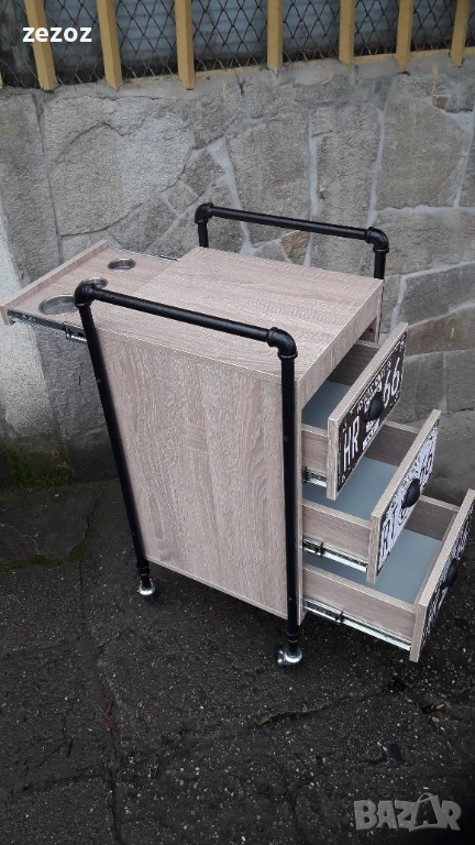 Внос от Европа.Шкаф в индустриален стил с 3-ри чекмеджета и издъпваща се поставка за чаши в задната част.Механизмите на чекмеджетата са със система против неволно отваряне.Пияни силиконови колела.Много здрава изработка.Имаме два броя.Размери-