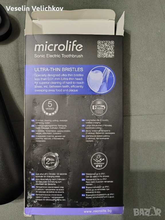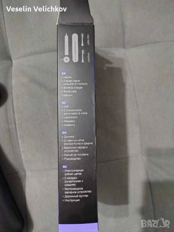 Четката беше заедно в комплект с апарат за кръвно, купих я за подарък, за баща ми, но той само веднъж я изпробва и не можа да се справи с нея, и естествено не иска да я ползва. Затова едната глава към комплекта няма как да я предложа, защото е използвана. Има калъф, зарядно към нея. Гаранцията също не мога да изпратя, защото е заедно с апарата за кръвно и затова цената на четката е съобразена с липсата на една глава и гаранция. На едната снимка съм снимал касовата бележка, за да се види кога е купувана четката. Аз използвам същата четка и смея да твърдя, че тази четка с нищо не отстъпва на прехвалените Панасоник. Супер безшумна е и има 5 режима на работа.