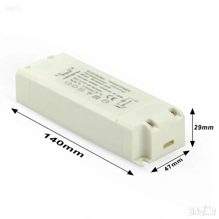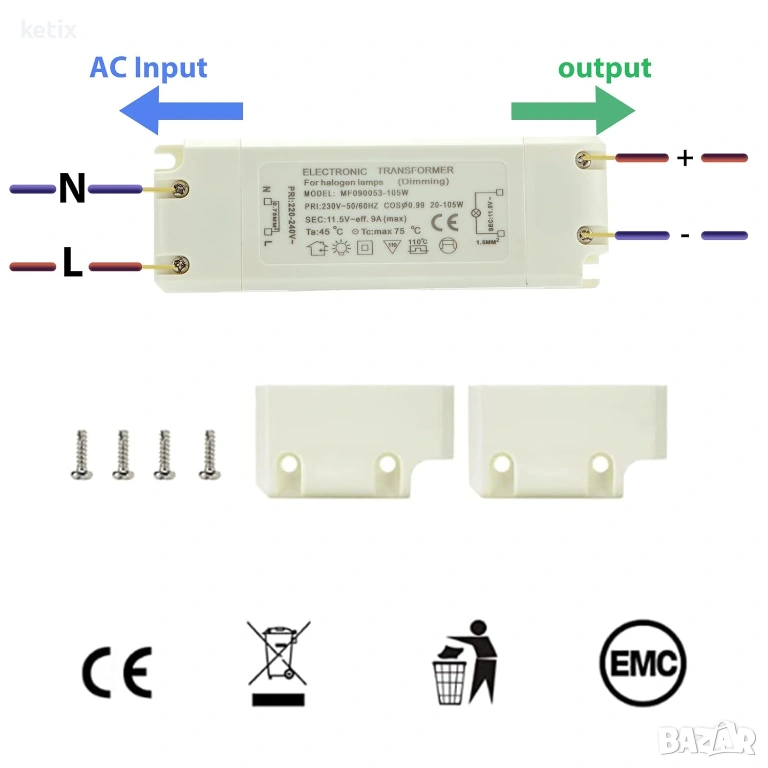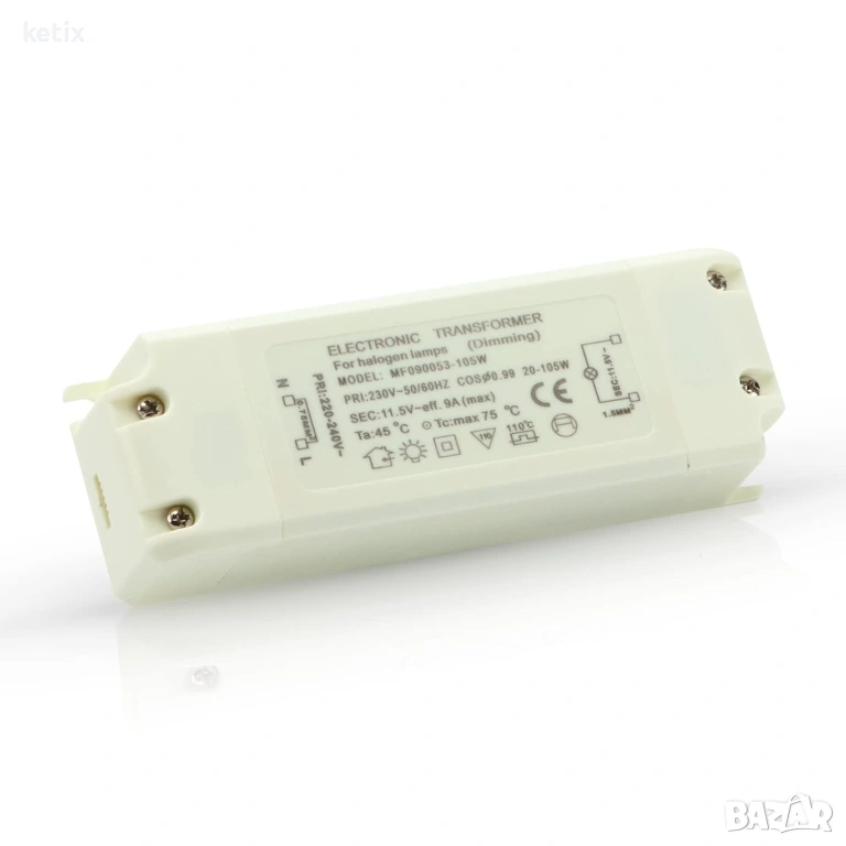 Трансформатор Yafido 230V(AC) към 12V(AC) 20-105W, защита от претоварване за халогенни трансформатори, димируем за халогенни лампи