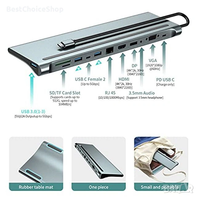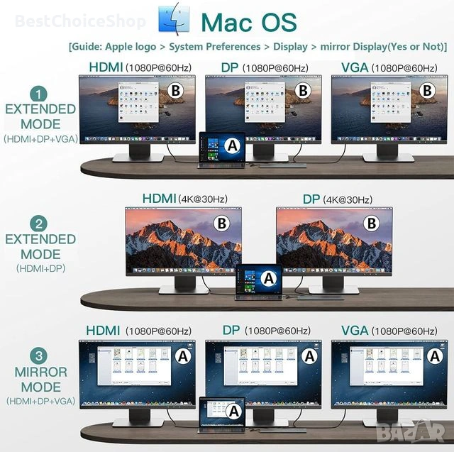 HDMI, DP и VGA портове: поддържат видео резолюции 4K@30Hz (HDMI и DP), 1080p@60Hz (VGA); при едновременно използване, максималната поддържана резолюция е 1080p