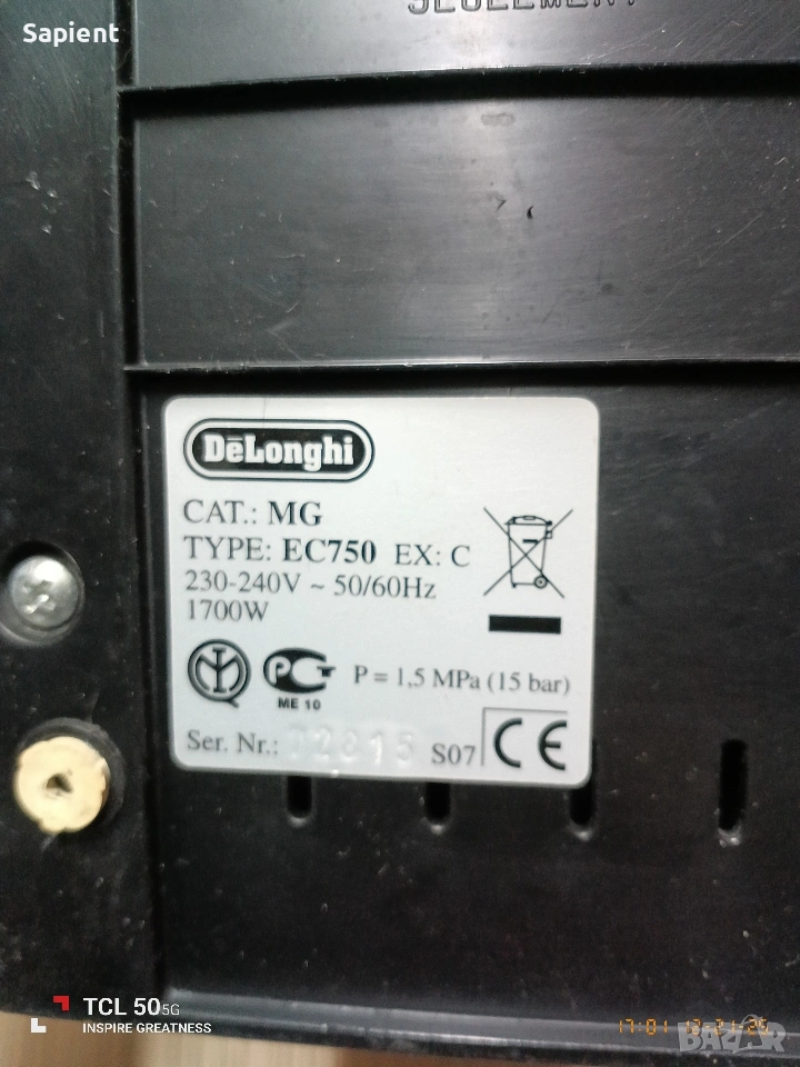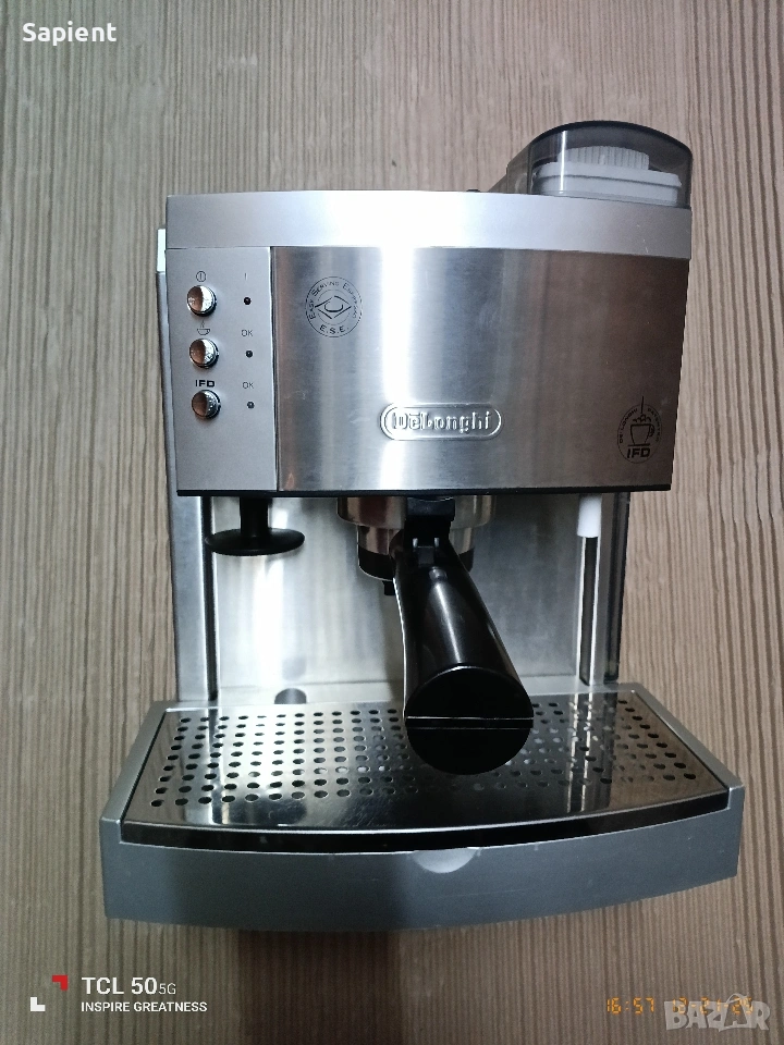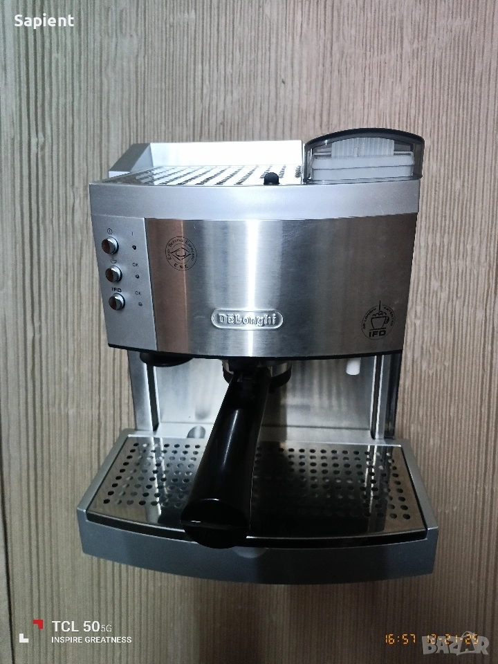 кафемашина DeLonghi, CAT. MG, TYPE: EC750 EX: C. Оборудвана с качествен бойлер от неръждаема стомана, мощност 1700W, налягане на помпата 15 бара, комбинирана, работи както с мляно кафе, така и с капсули E.S.E. Снабдена с уникална за марката система за приготвяне на капучино. В комплект с ръкохватка и цедка за 1-2 кафета, с крема диск! Почти неизползвана, като нова!