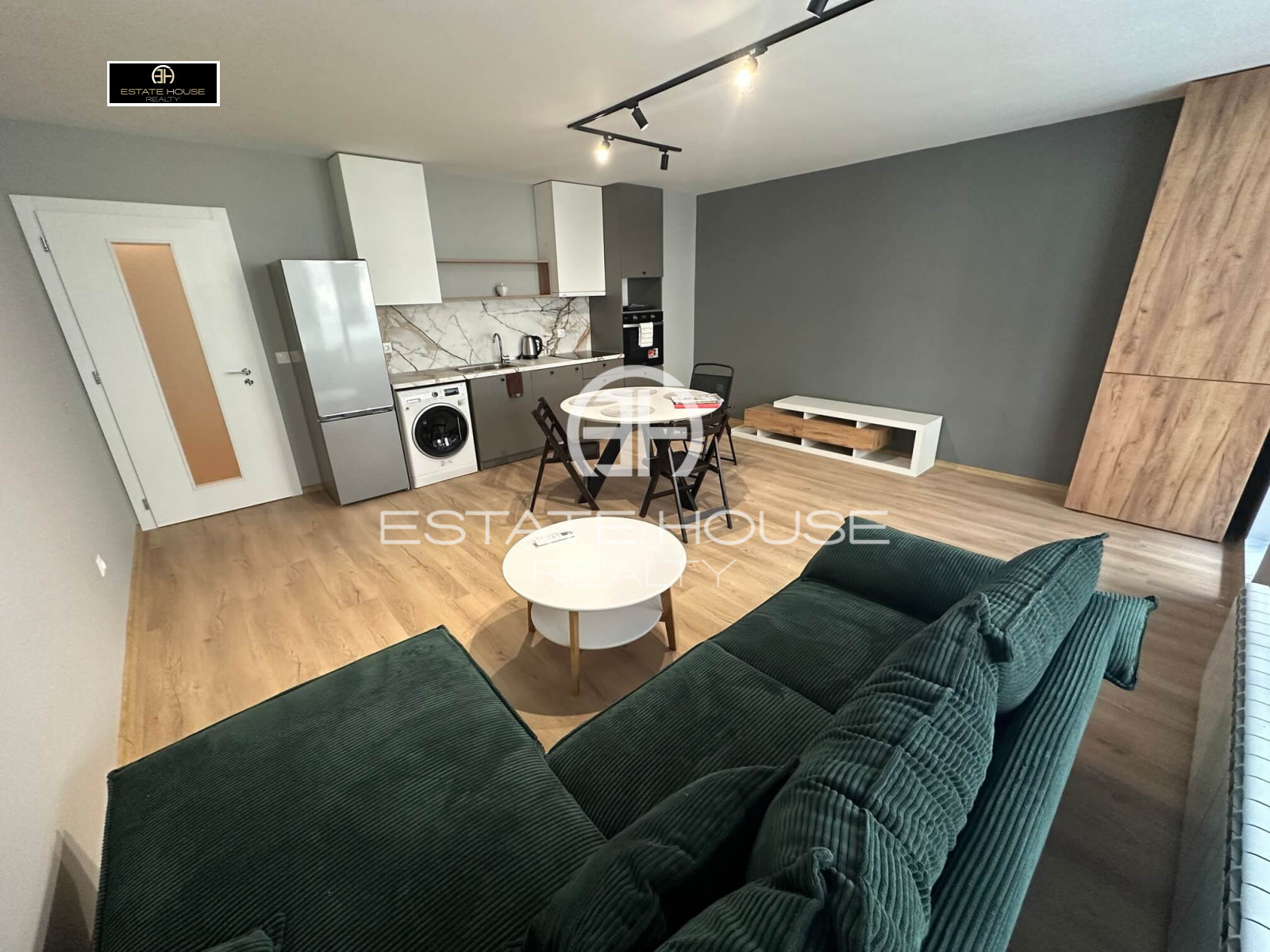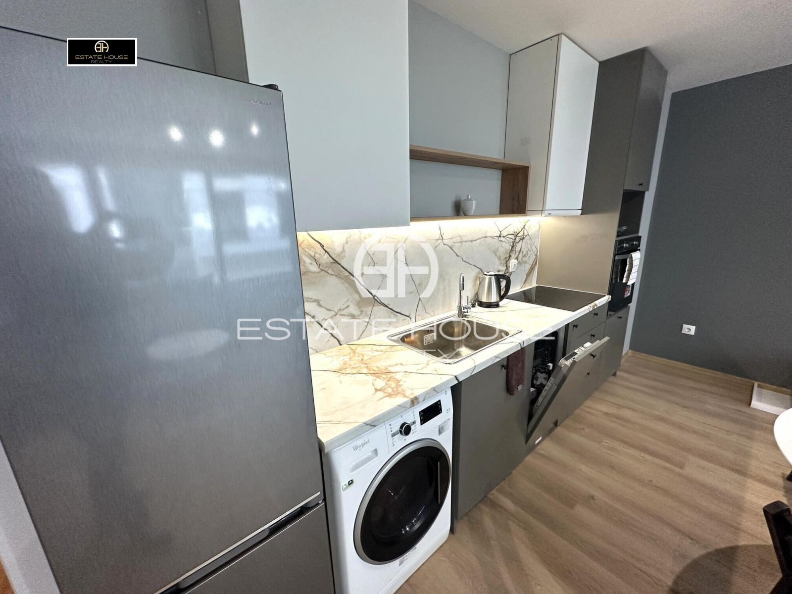 Жилището е чисто ново, напълно обзаведено и оборудвано с всичко необходимо за комфортен живот. Кухнята включва висококачествени електроуреди: хладилник, фурна, стъклокерамични котлони, съдомиялна, абсорбатор и комбинирана пералня със сушилня.
