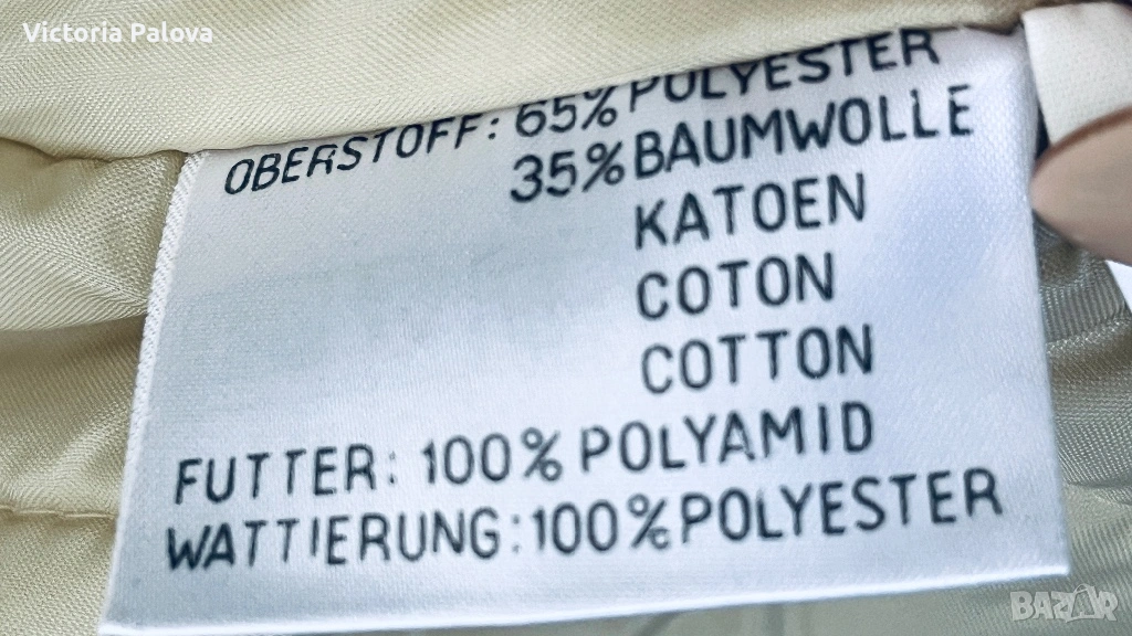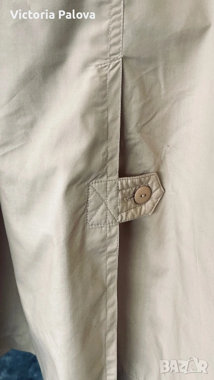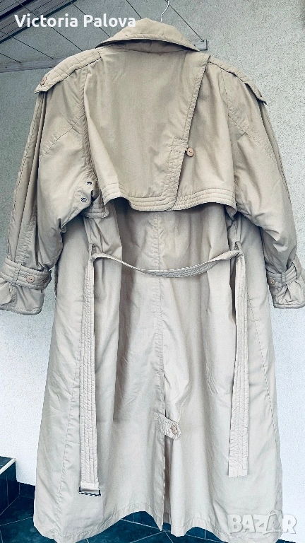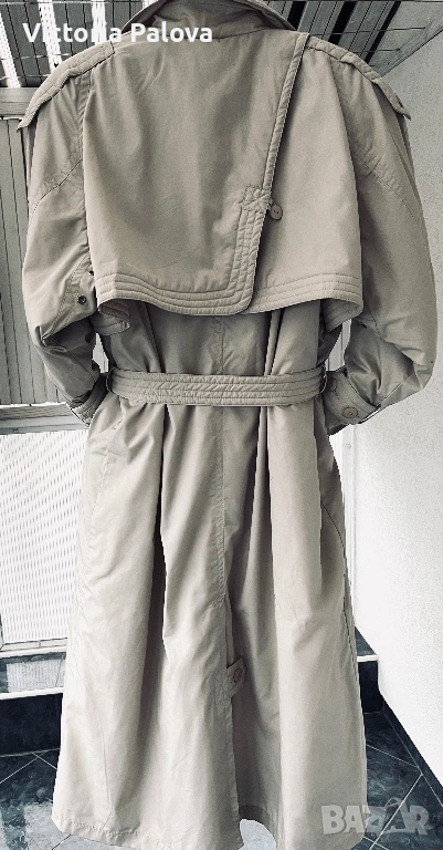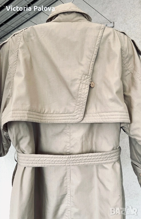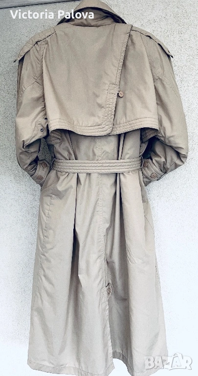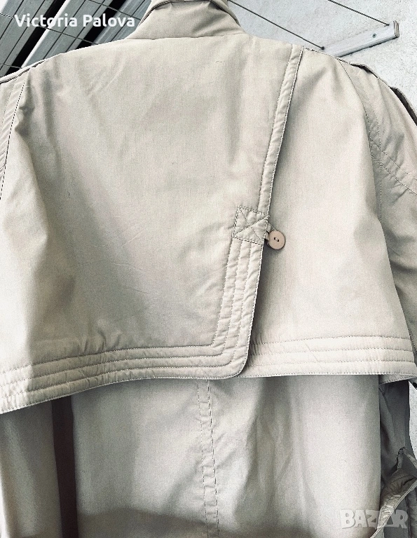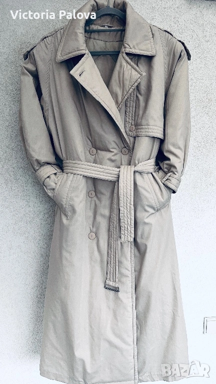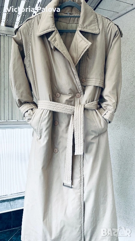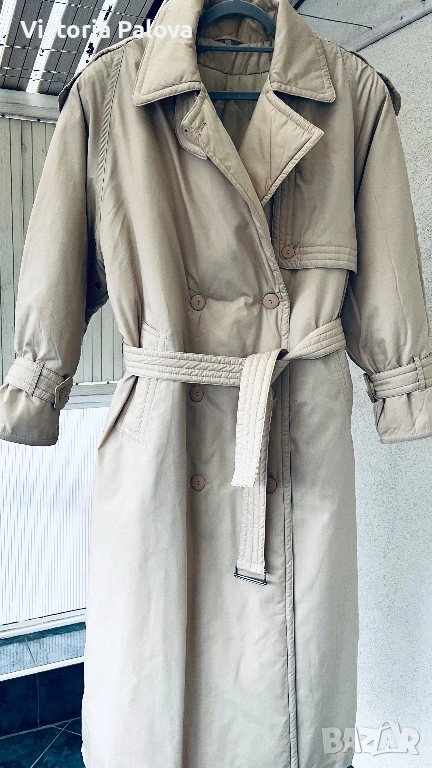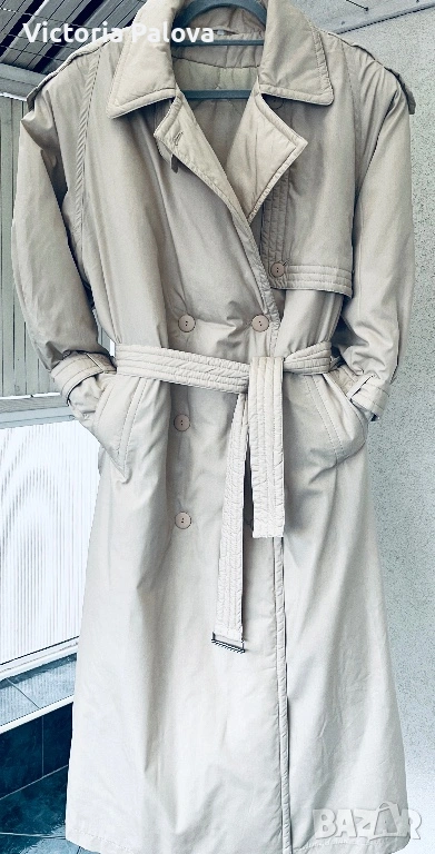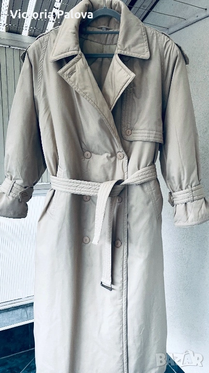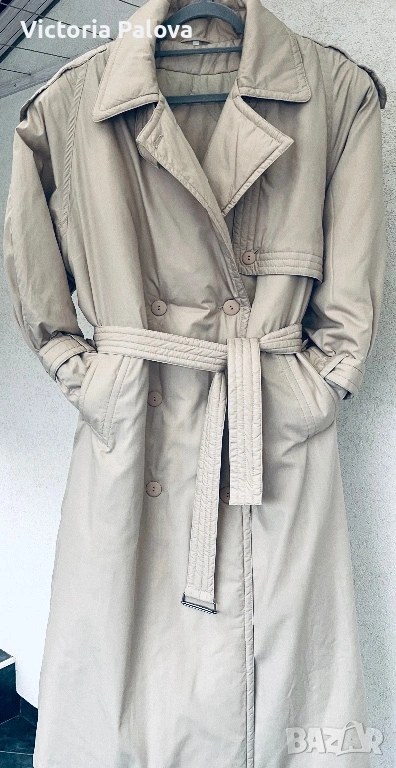 Изключително елегантен дамски тренч в класически бежов цвят, вдъхновен от иконичните модели на луксозните модни къщи. С изчистена, но силно структурирана кройка, този модел оформя красиво силуета, подчертава талията с колан и създава издължена линия. Двуредното закопчаване с матови копчета в тон, декоративните пагони на раменете и характерната пелерина на гърба придават автентичен trench coat характер. Материята е лека, но подплатена и ватирана, което го прави напълно подходящ и като палто за по- хладно време - стилен и практичен заместител на класическо палто. Европейски размер 44, стои отлично и като леко oversized за модерна визия. Истинска дизайнерска находка за гардероб с класа.