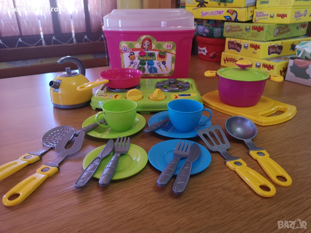 Снимка 7 и 8: ДЕТСКА МИНИ КУХНЯ В РОЗОВА КУТИЯ С ДРЪЖКА И С КУХНЕНСКИ АКСЕСОАРИ, цена 8,80€