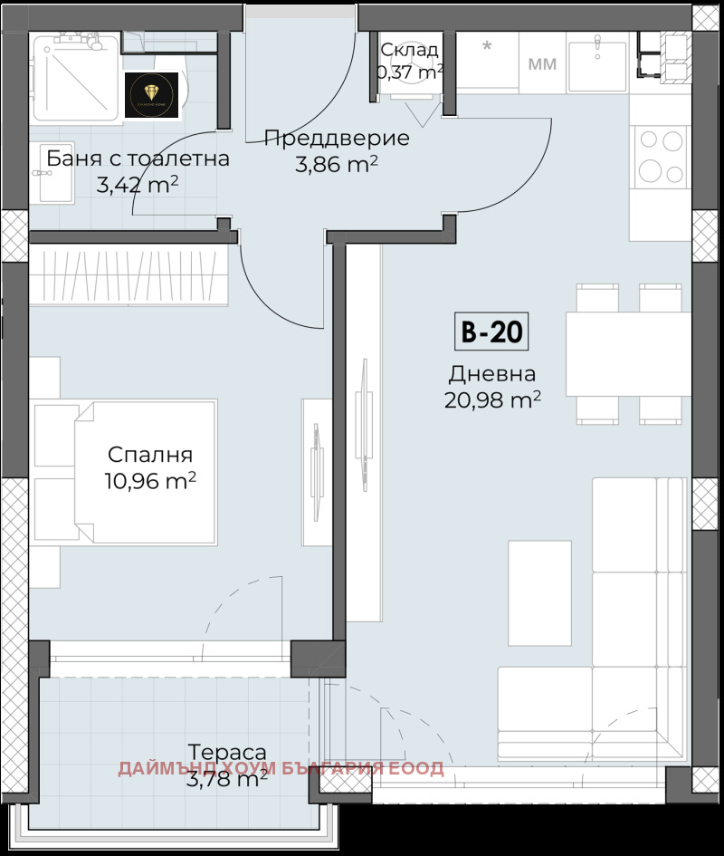 📐 Разпределение: Входно антре, дневна-трапезария-кухненски бокс, спалня, тераса, баня+wc.