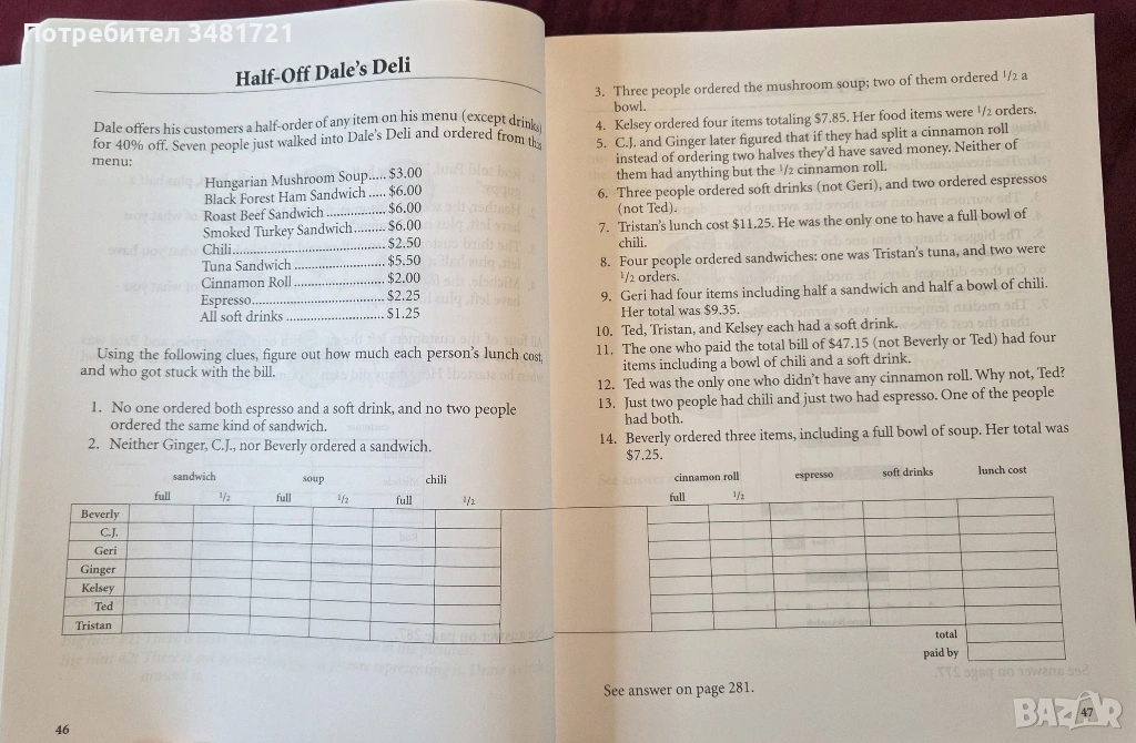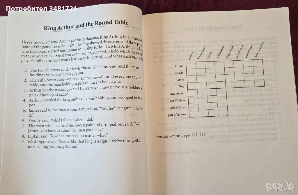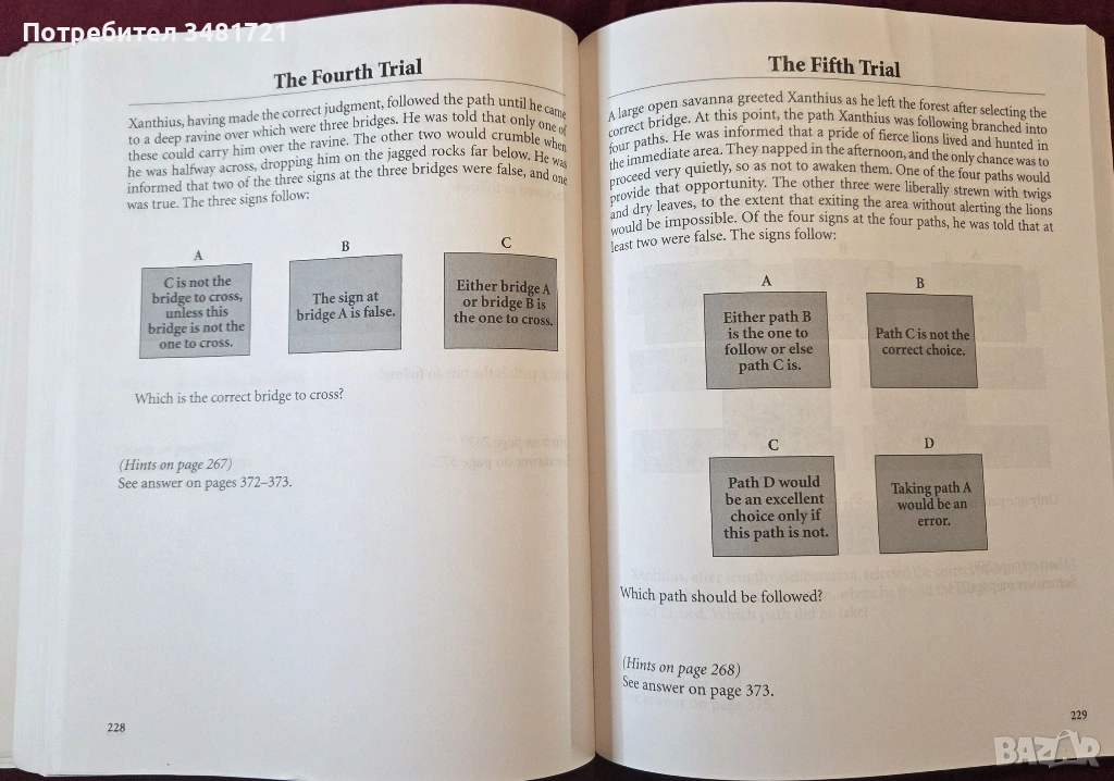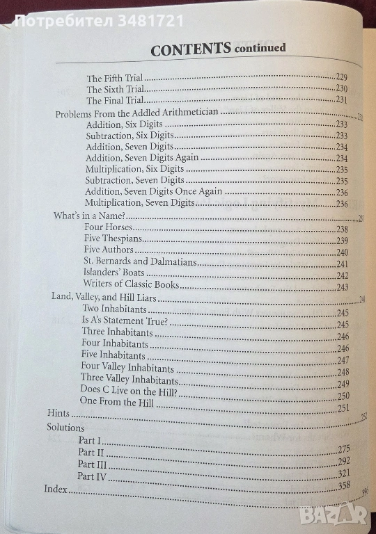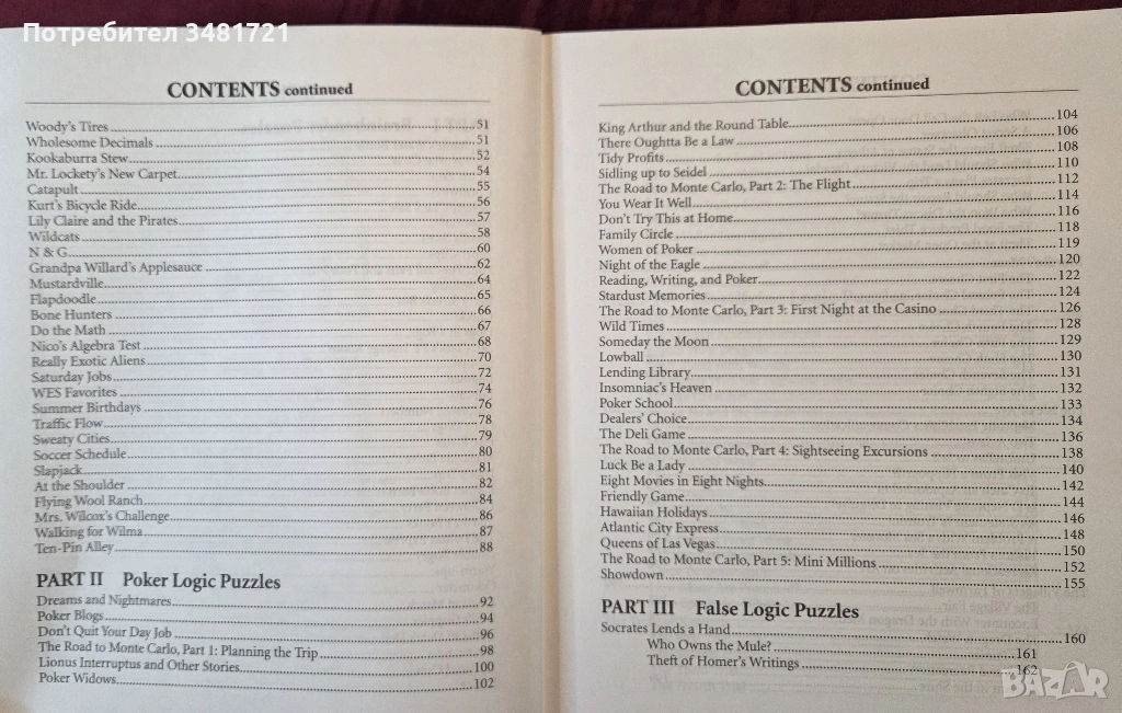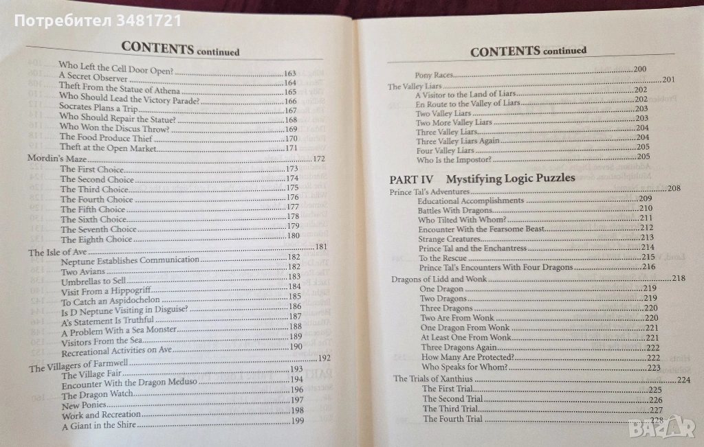Голяма колекция от логически пъзели и загадки. Част от тях са визуални, други са под формата на история с минимално необходимата информация за решение. С включени отговори за всеки. Някои поставят читателя в хазартна среда, други в приятелска игра или професионален турнир. Едни го отвеждат в мистериозна история, вплитаща верни и грешни твърдения, други ще го накарат да търси отговора по метода на проба-грешка. Занимателна книга за тези, които обичат да предизвикват ума си с логически задачи.