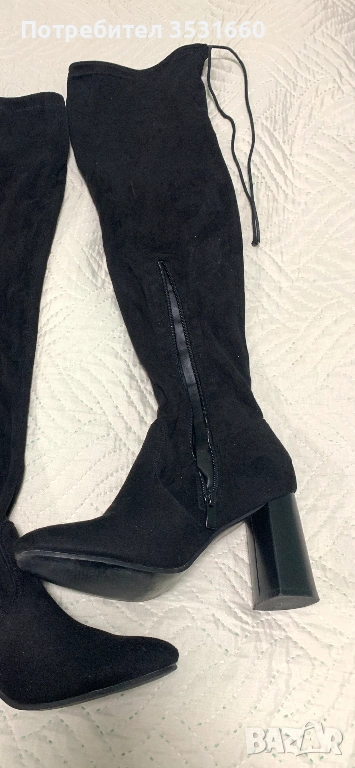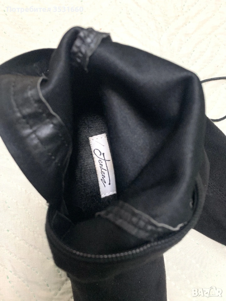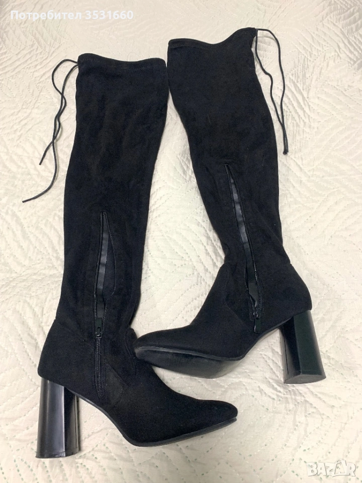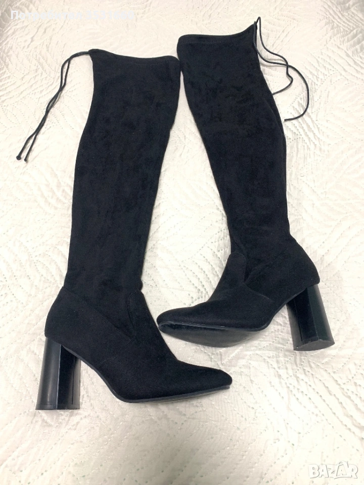 Дамски чизми- тип “чорап”, велур, черни номер 40. Заострена предна част. Изчистен дизайн. Връзки в горната част.