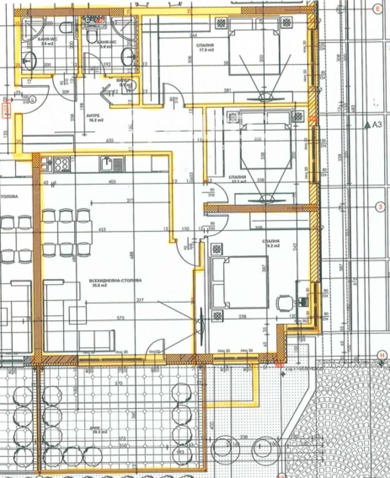 Състои се от: широко антре - 16кв.м., просторна дневна с кухненска част - 36кв.м., три спални - 18кв.м., 12кв.м., 16кв.м., две бани с тоалетни, килер и тераса-двор - 21кв.м..