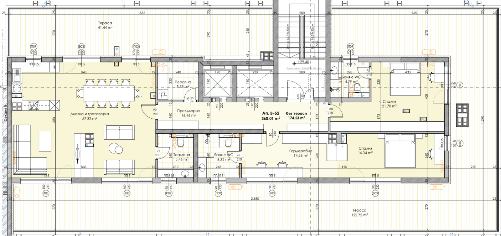 Апартаментът се намира на последен етаж, състоящ се от просторна дневна с трапезария, 1 спалня с баня и тоалетна, втора спалня с баня с тоалетна и гардеробна към нея, перално и прекрасна голяма панорамна тераса.