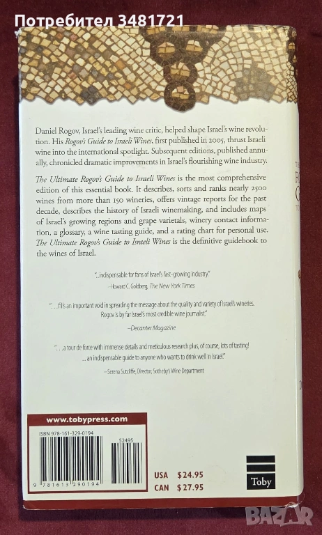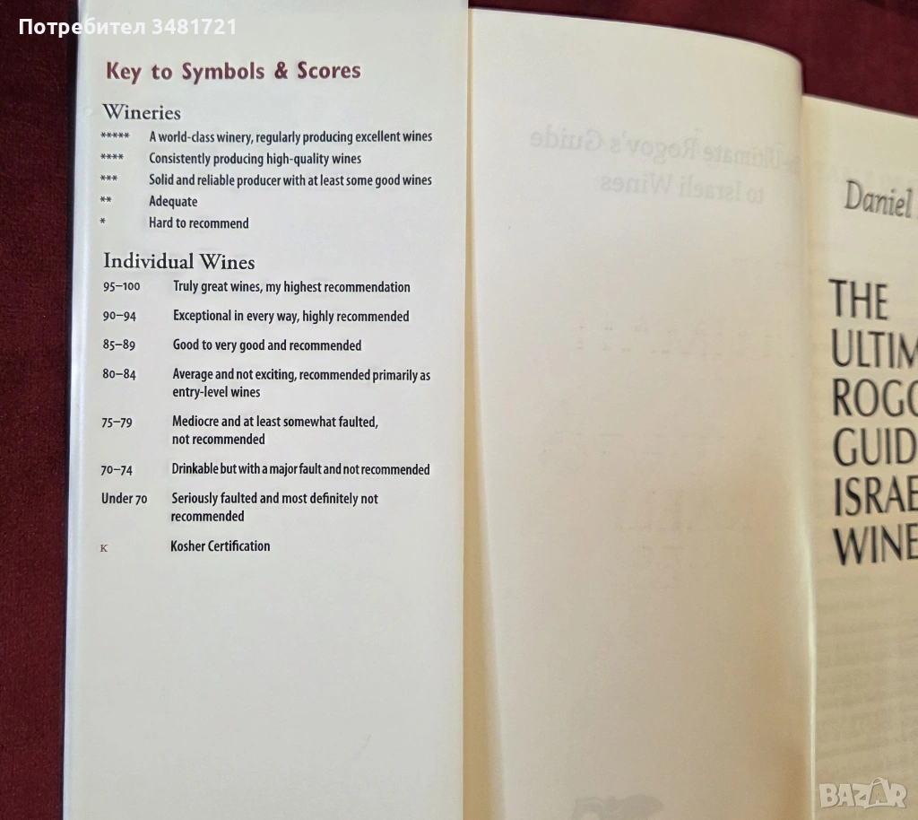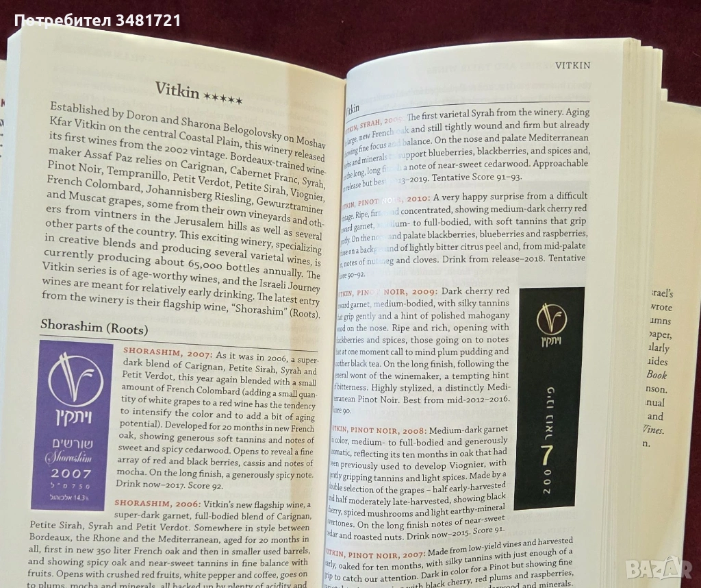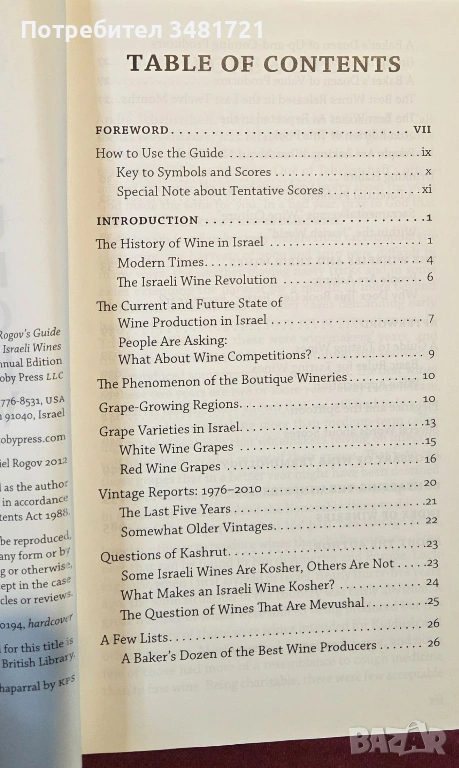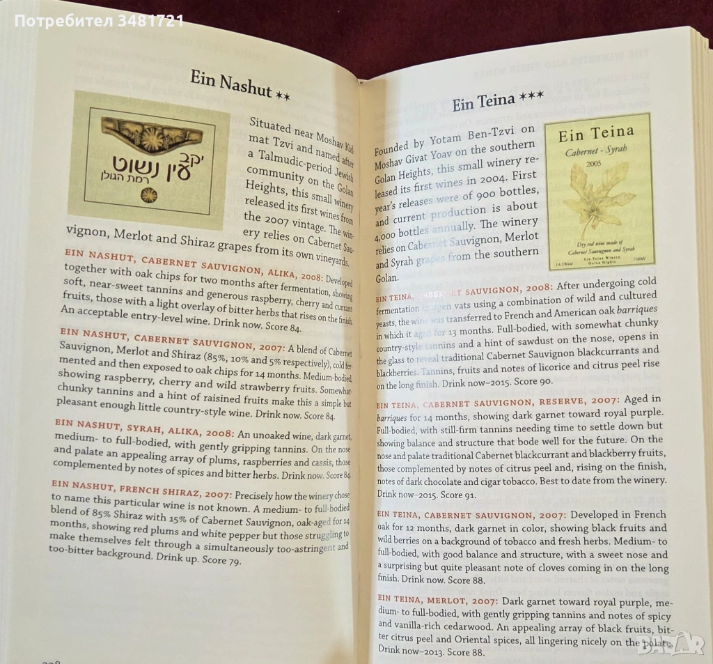 В последните десетилетия Израел все по-уверено се настанява на световната сцена на винопроизводителите. В своите 150 винарни държавата произвежда хиляди вина всяка година. Авторът на справочникът представя над 2500 вина, давайки оценка за всяко по своя методология. Представени са в текст, карти и илюстрации различните региони, сортове и реколти, история на винопроизводството, поглед върху най-добрите варианти за закупуване при реколтите от 1976 до 2010та година. Вътрешната част на обложката, също така, се разгъва и цялата представлява професионален лист за попълване на впечатления след дегустация на вино.