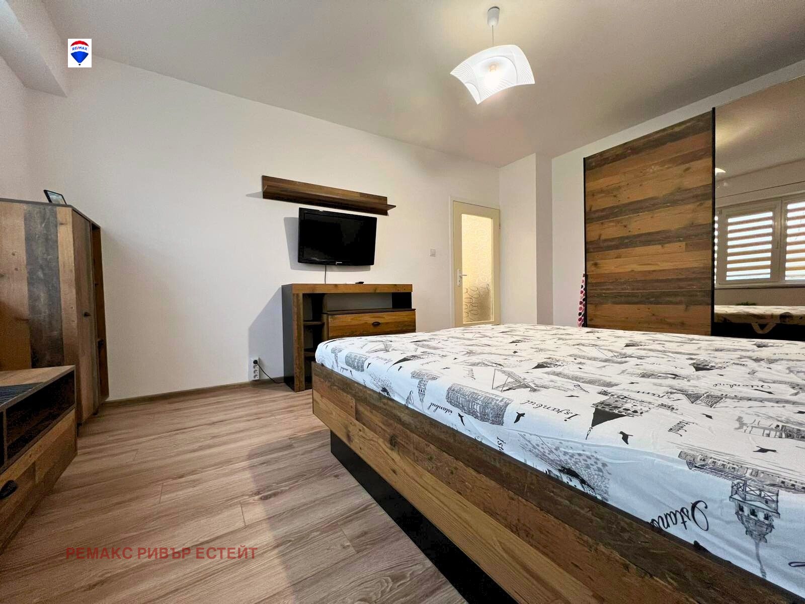 - Просторна спалня обзаведена с голямо двойно легло, нощни шкафчета, гардероб с плъзгащи огледални врати, скрин, TV и климатик Mitsubishi;