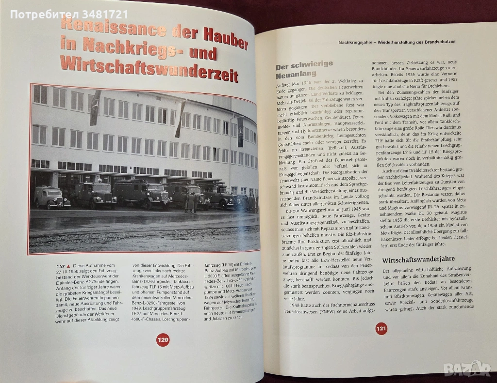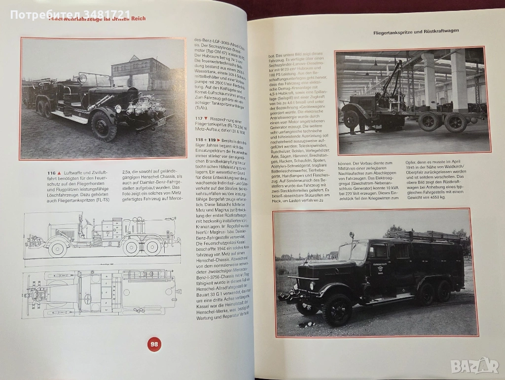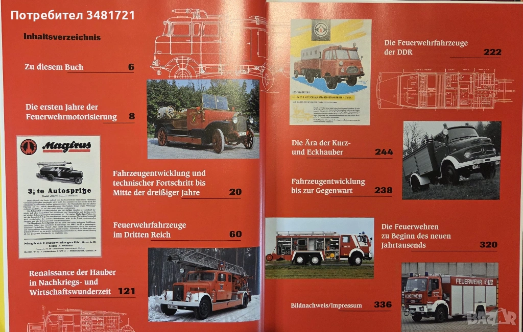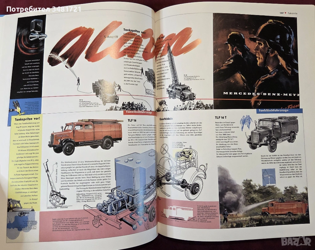 Подробна и много богата на снимков материал, таблици, графики и профили с технически данни, книгата представя всички видове пожарни средства от края на 19ти век до зората на 21ви по немските земи. Включена е историята на превозните средства, начините на използване, двигатели и други технически параметри, задно с друга любопитна информация. Книгата включва и краткo списание Feuerwehrfahrzeuge der Welt.