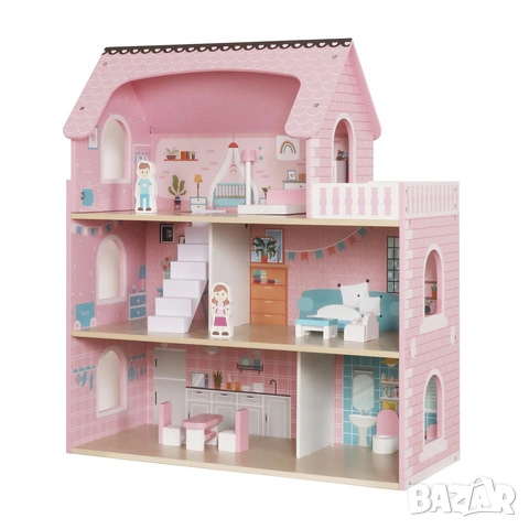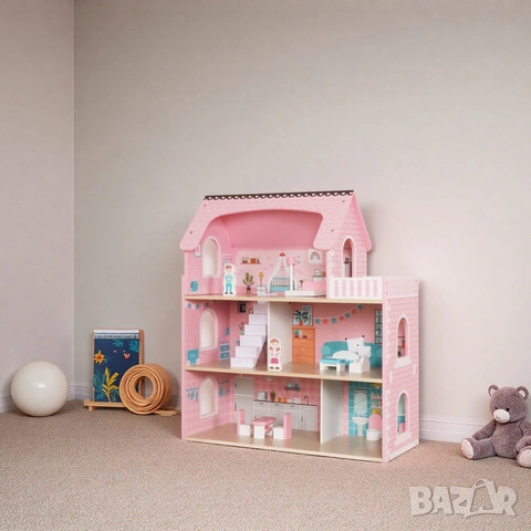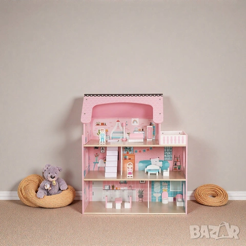• Голяма дървена къща за кукли на 3 нива – просторна и удобна за игра