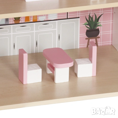 Тази голяма дървена къща за кукли е мечтата на всяко дете – стабилна, красива и напълно оборудвана за часове творческа игра. Със своите 3 нива, 5 стаи и балкон, както и с включено LED осветление, къщичката прави играта още по-реалистична и вълнуваща. Изработена е от гладко обработено дърво, без остри ръбове, което я прави безопасна и подходяща за ежедневна игра. В комплекта има мебели и аксесоари, така че детето може да започне да играе веднага след сглобяването.